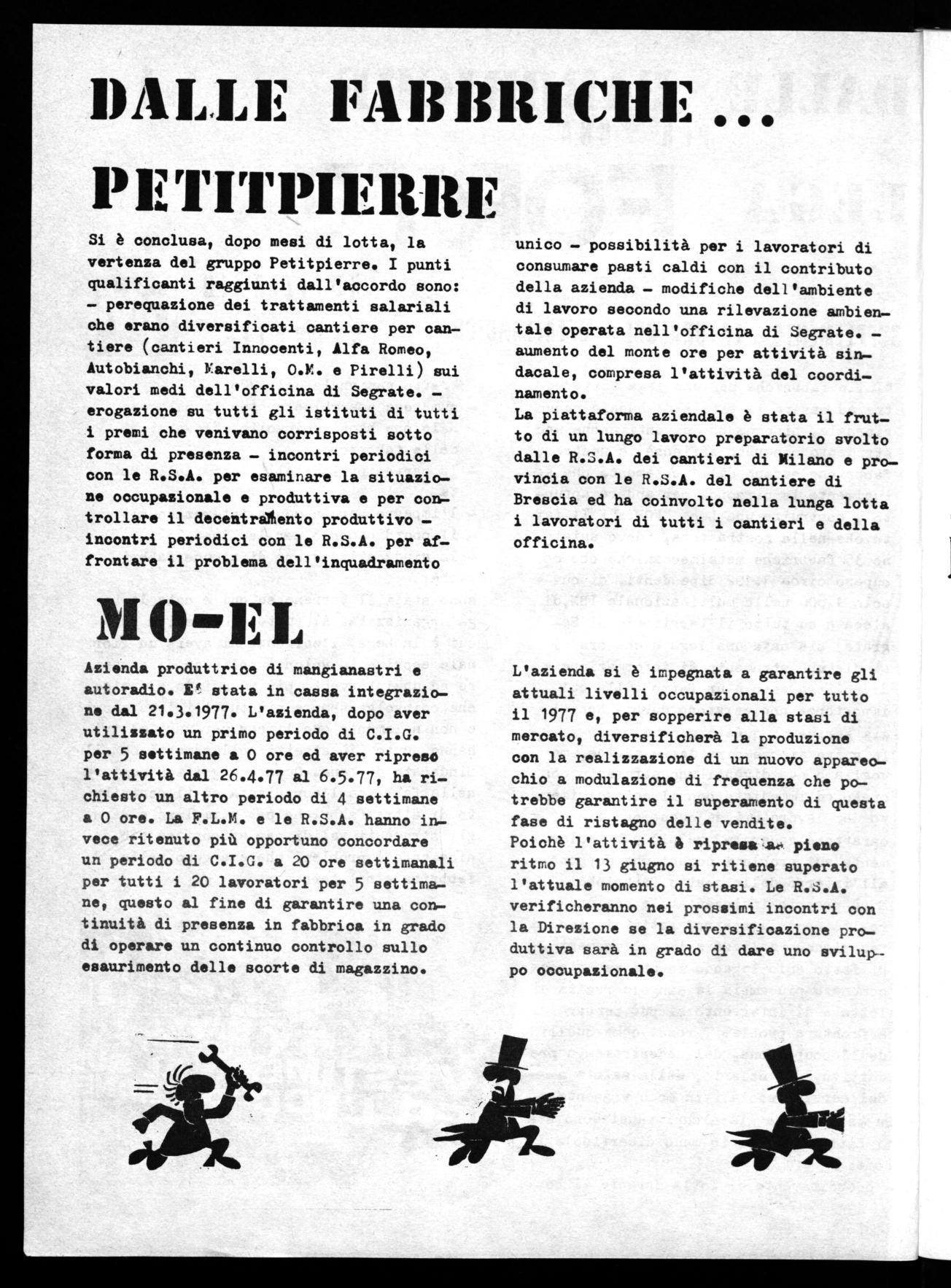 Si è conclusa, dopo mesi di lotta, la vertenza del gruppo Petitpierre. I punti qualificanti raggiunti dall'accordo sono: - perequazione dei trattamenti salariali che erano diversificati cantiere per cantiere (cantieri Innocenti, Alfa Romeo, Autobianchi, O.M. e Pirelli) sui valori medi dell'officina di Segrate.erogazione su tutti gli istituti di tutti i premi che venivano corrisposti sotto forma di presenza - incontri periodici con le R.S.A. per esaminare la situazione occupazionale e produttiva e per controllare il decentra:Mento produttivoincontri periodici con le R.S.A. per affrontare il problema dell'inquadramento