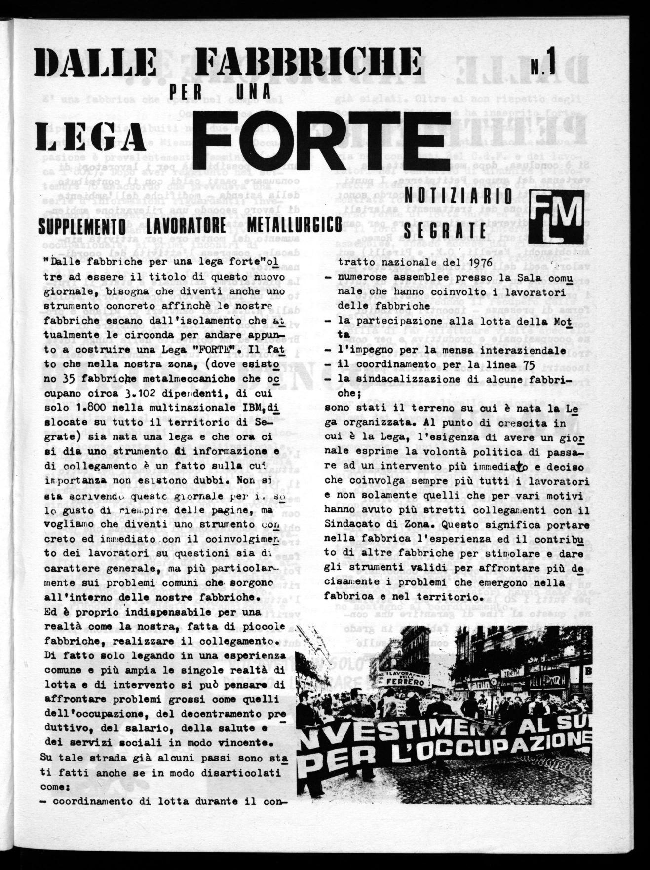 "balle fabbriche per una lega forte"ol tre ad essere il titolo di questo nuovo giornale, bisogna che diventi anche uno strumento concreto affinchè le nostre fabbriche escano dall'isolamento che a;, tualmente le circonda per andare appunto a costruire una Lega "FORTE". Il fat to che nella nostra zona, (dove esisto no 35 fabbriche metalmeccaniche che oc cupano circa 3.102 dipendenti, di cui solo 1.800 nella multinazionale IBM,di slocate su tutto il territorio di Segrate) sia nata una lega e che ora ci si dia uno strumento di informazione e di collegamento è un fatto sulla cut importanza non esistono dubbi. Non si sta scrivendo queste giornale per i. lo gusto di riempire delle pagine, ma vogliano che diventi uno strumento uon creto ed immediato .con il coinvolgimen to dei lavoratori su questioni sia di carattere generale, ma più particolarmente sui problemi comuni che sorgono all'interno delle nostre fabbriche.