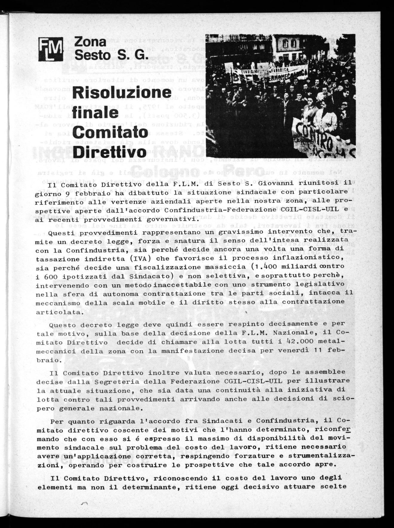 Il Comitato Direttivo della F.L.M. di Sesto S. Giovanni riunitosi il giorno 9 febbraio ha dibattuto la situazione sindacale con particolare riferimento alle vertenze aziendali aperte nella nostra zona, alle prospettive aperte dall'accordo Confindustria-Federazione CGIL-CISL-UIL e ai recenti provvedimenti governativi.