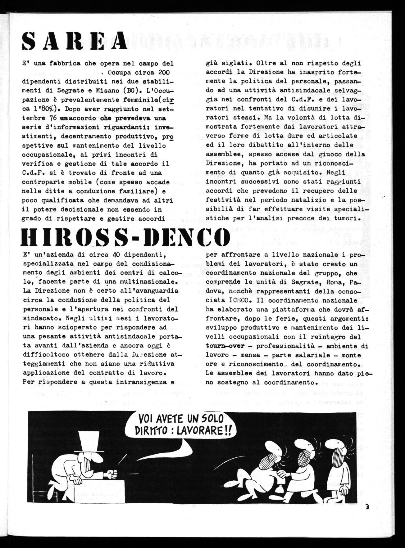 già siglati. Oltre al non rispetto degli accordi la Direzione ha inasprito fortemente la politica del personale, passando ad una attività antisindacale selvaggia nei confronti del C.d.F. e dei lavoratori nel tentativo di disunire i lavoratori stessi. Ma la volontà di lotta dimostrata fortemente dai lavoratori attraverso forme di lotta dure ed articolate ed il loro dibattito all'interno delle assemblee, spesso accese dal giuoco della Direzione, ha portato ad un riconoscimento di quanto già acquisito. Negli incontri successivi sono stati raggiunti accordi che prevedono il recupero delle festività nel periodo natalizio e la possibilià di far effettuare visite specialistiche per l'analisi precoce dei tumori.