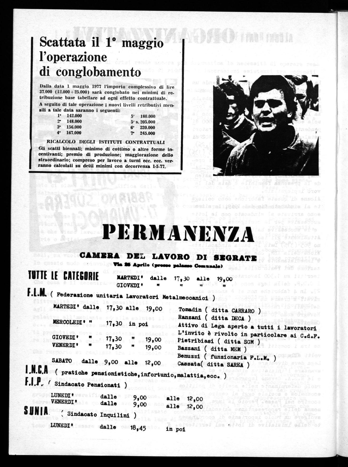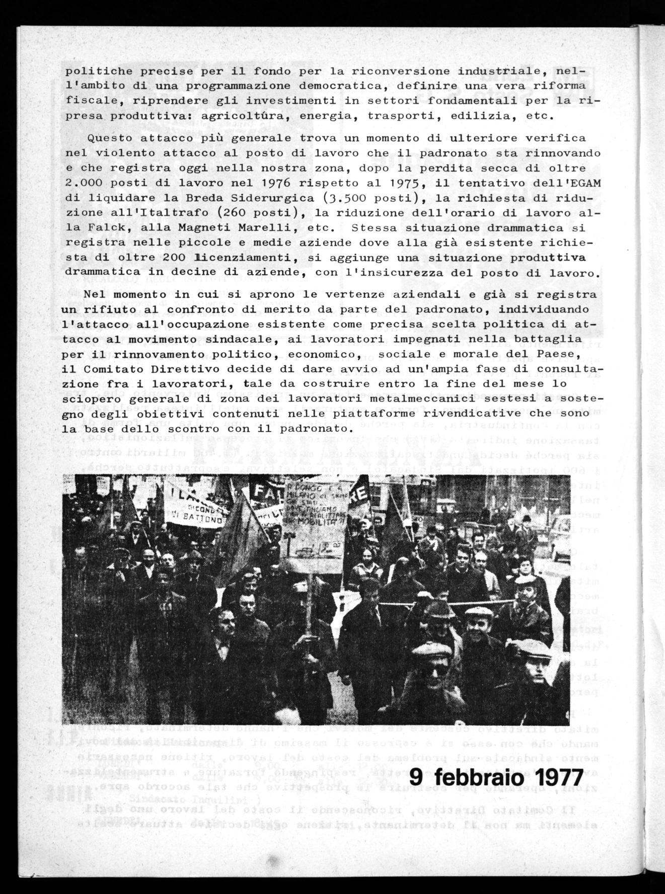 Questo attacco più generale trova un momento di ulteriore verifica nel violento attacco al posto di lavoro che il padronato sta rinnovando e che registra oggi nella nostra zona, dopo la perdita secca di oltre 2.000 posti di lavoro nel 1976 rispetto al 1975, il tentativo dell'EGAM di liquidare la Breda Siderurgica (3.500 posti), la richiesta di riduzione all'Italtrafo (260 posti), la riduzione dell'orario di lavoro alla Falck, alla Magneti Marelli, etc. Stessa situazione drammatica si registra nelle piccole e medie aziende dove alla già esistente richiesta di oltre 200 licenziamenti, si aggiunge una situazione produttiva drammatica in decine di aziende, con l'insicurezza del posto di lavoro.