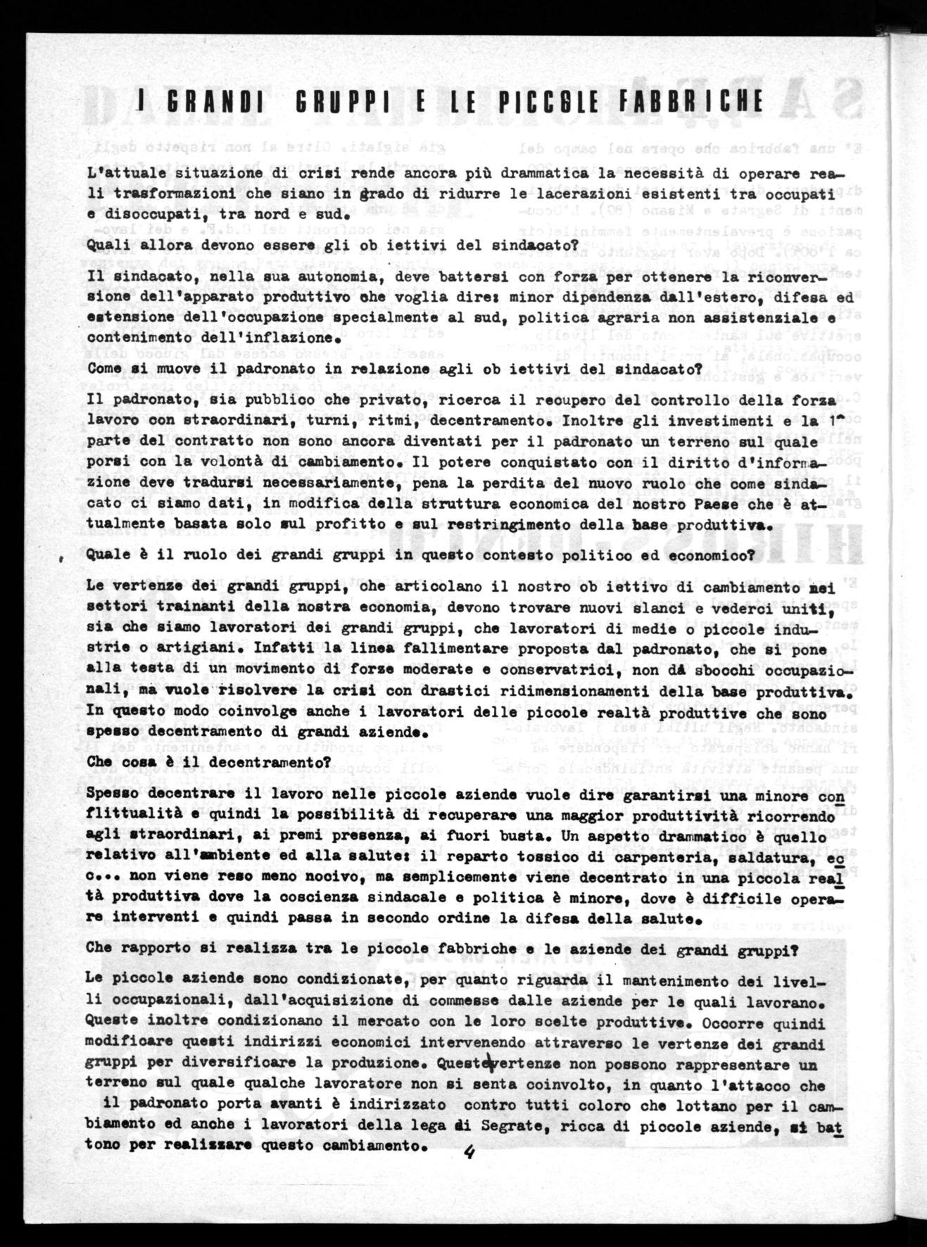 Le vertenze dei grandi gruppi, che articolano il nostro ob iettivo di cambiamento nei settori trainanti della nostra economia, devono trovare nuovi slanci e vederci uniti, sia Che siamo lavoratori dei grandi gruppi, che lavoratori di medie o piccole indu— strie o artigiani. Infatti la linea fallimentare proposta dal padronato, che si pone alla testa di un movimento di forze moderate e conservatrici, non dA sbocchi occupazio— nali, ma vuole risolvere la crisi con drastici ridimensionamenti della base produttiva. In questo modo coinvolge anche i lavoratori delle piccole realtà produttive che sono spesso decentramento di grandi aziende.