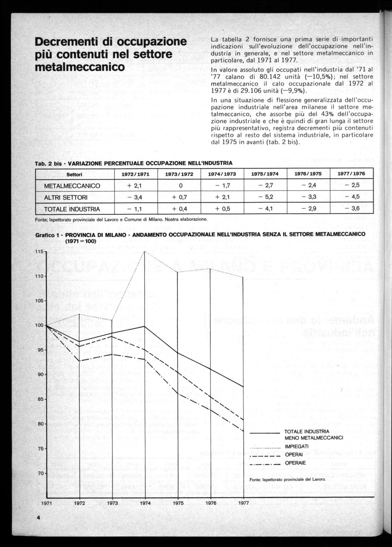 In una situazione di flessione generalizzata dell'occupazione industriale nell'area milanese il settore metalmeccanico, che assorbe più del 43% dell'occupazione industriale e che è quindi di gran lunga il settore più rappresentativo, registra decrementi più contenuti rispetto al resto del sistema industriale, in particolare dal 1975 in avanti (tab. 2 bis).