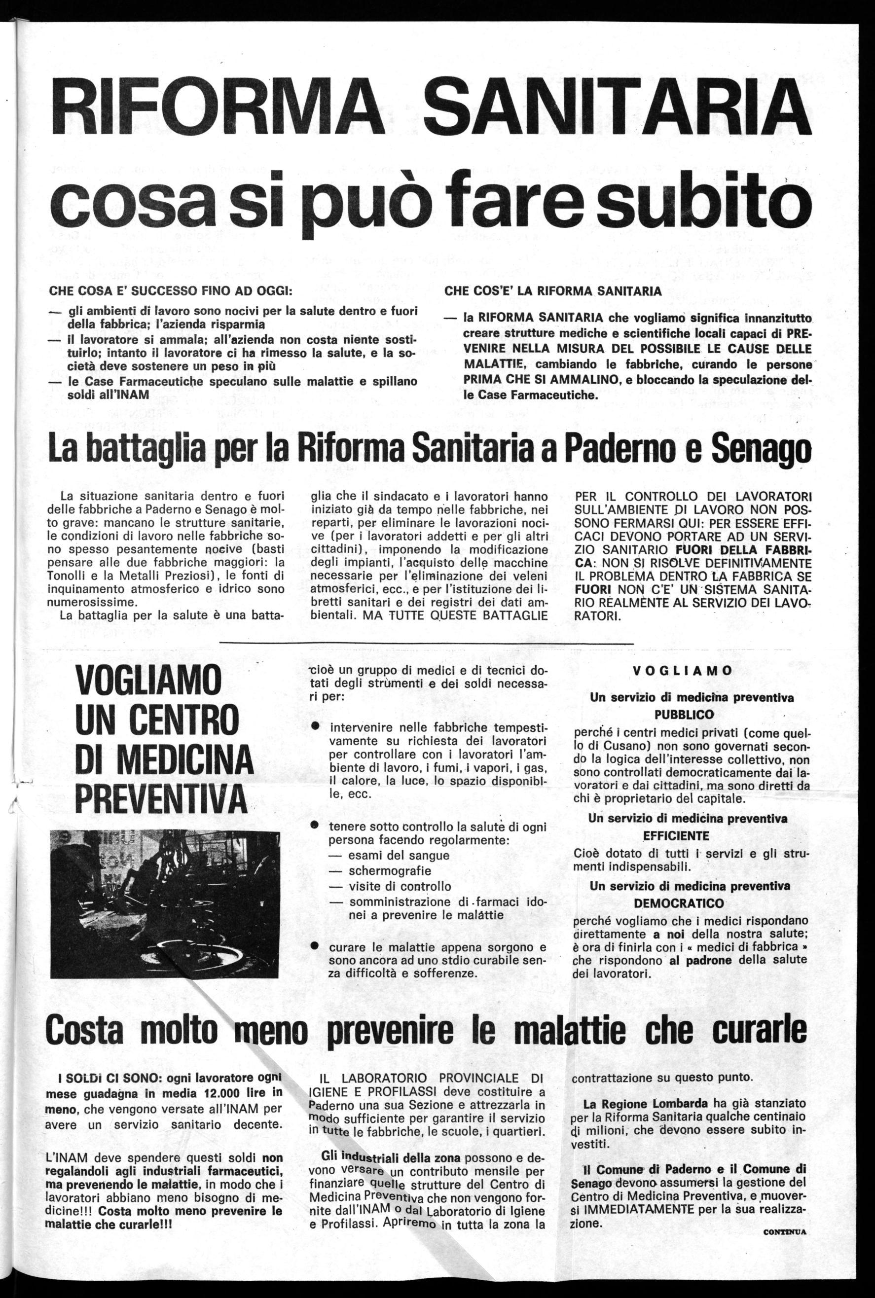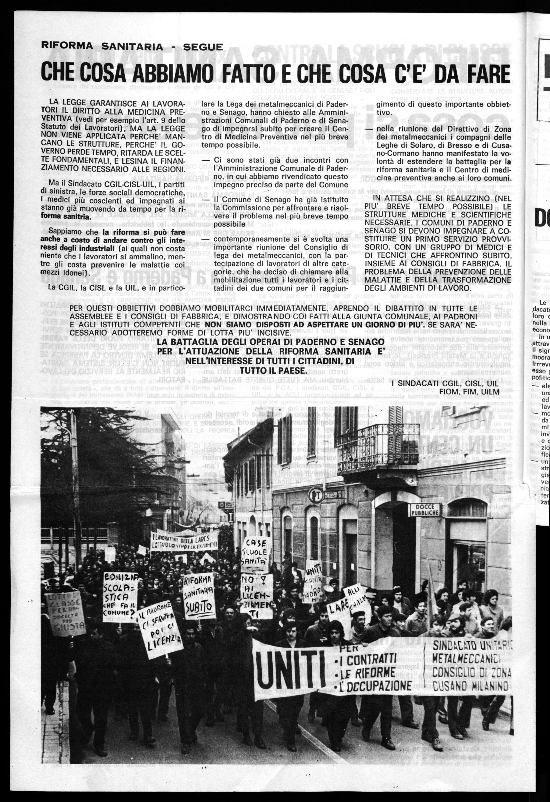 LA BATTAGLIA DEGLI OPERAI DI PADERNO E SENAGO PER L'ATTUAZIONE DELLA RIFORMA SANITARIA E' NELL'INTERESSE DI TUTTI I CITTADINI, DI TUTTO IL PAESE.