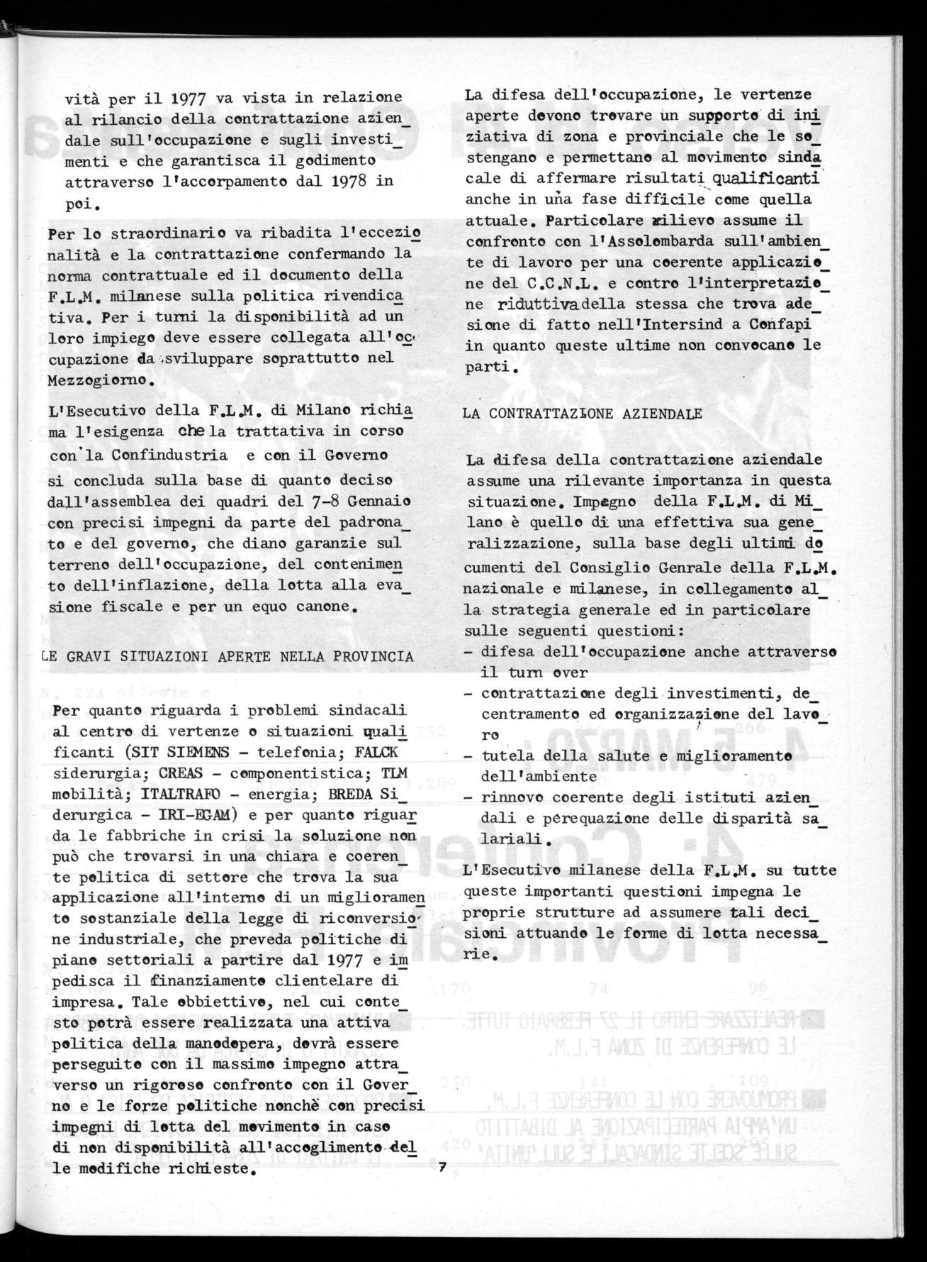 La difesa della contrattazione aziendale assume una rilevante importanza in questa situazione. Impegno della F.L.M. di Mi_ lano è quello di una effettiva sua gene_ ralizzazione, sulla base degli ultimi do cumenti del Consiglio Genrale della F.L.M. nazionale e milanese, in collegamento al la strategia generale ed in particolare sulle seguenti questioni: