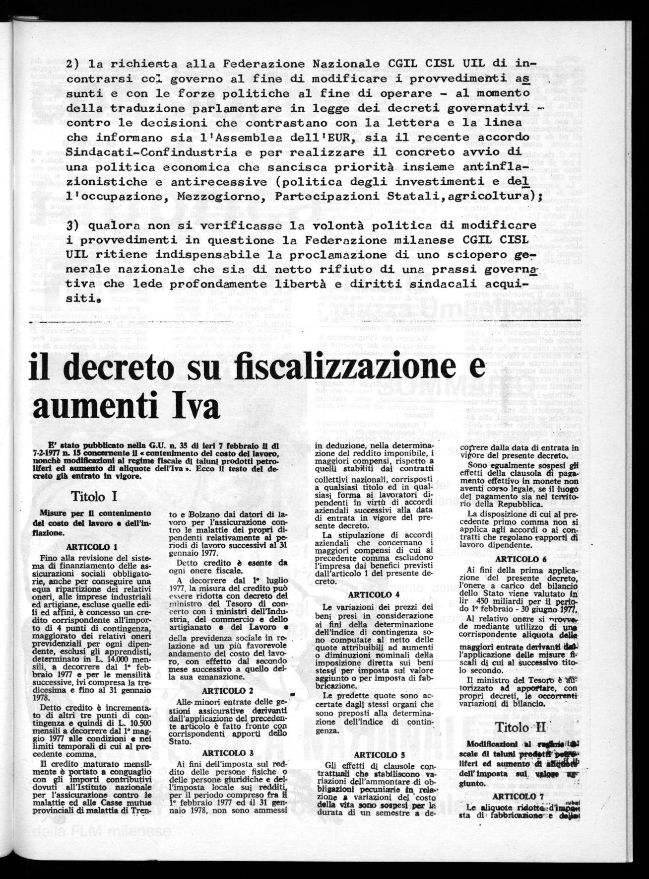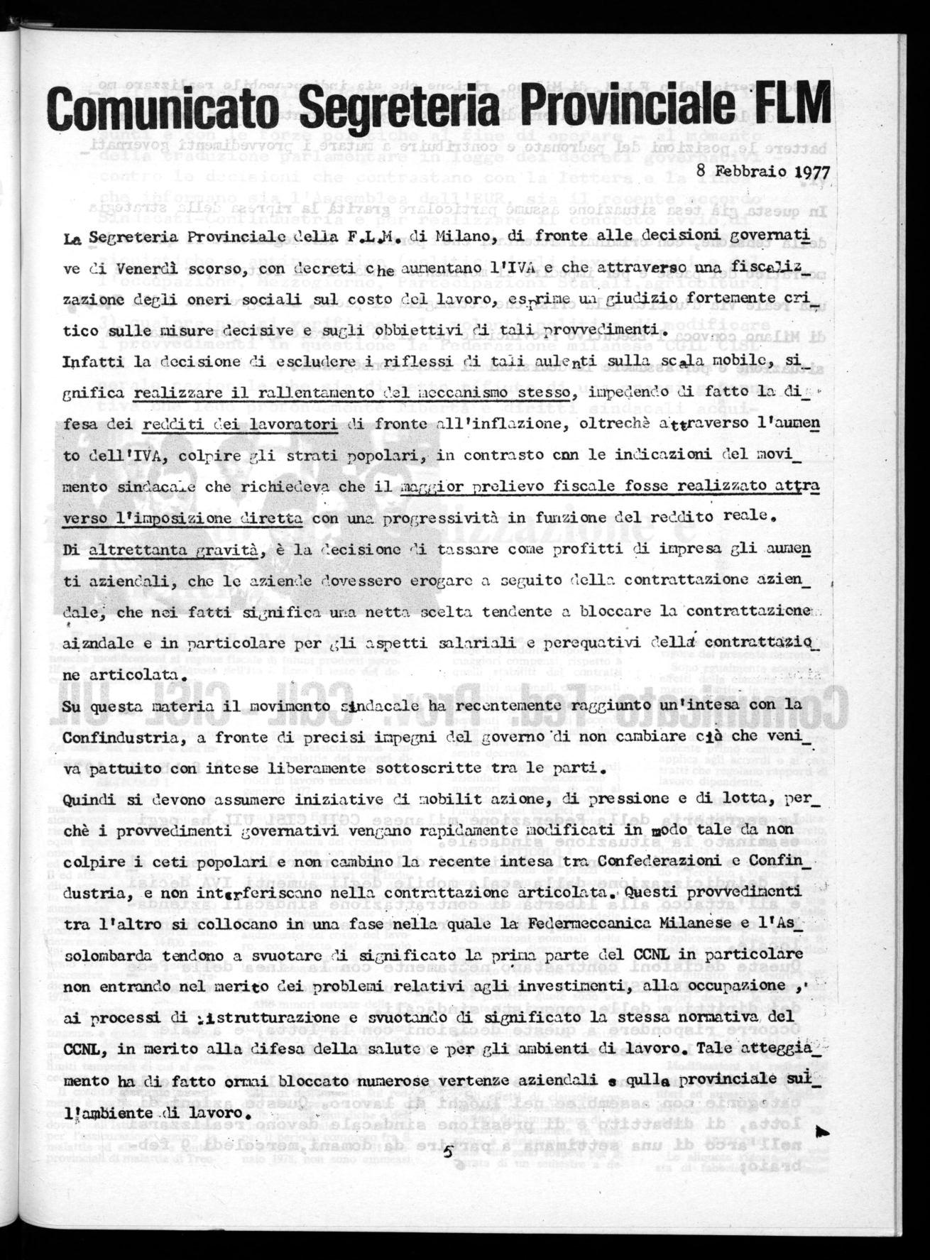IL COMITATO ESECUTIVO DELLA FLM RIUNITOSI AROMA L'8/2/77, CONSIDEfiA INACCETTABILE LE MISURE ADOTTATE DAL GOVERNO IN ORDINE ALLA FISCALIZZAZIONE DEGLI ONERI SOCIALI E ALLA ULTERIORE RIDUZIONE DEL COSTO DEL LAVORO.