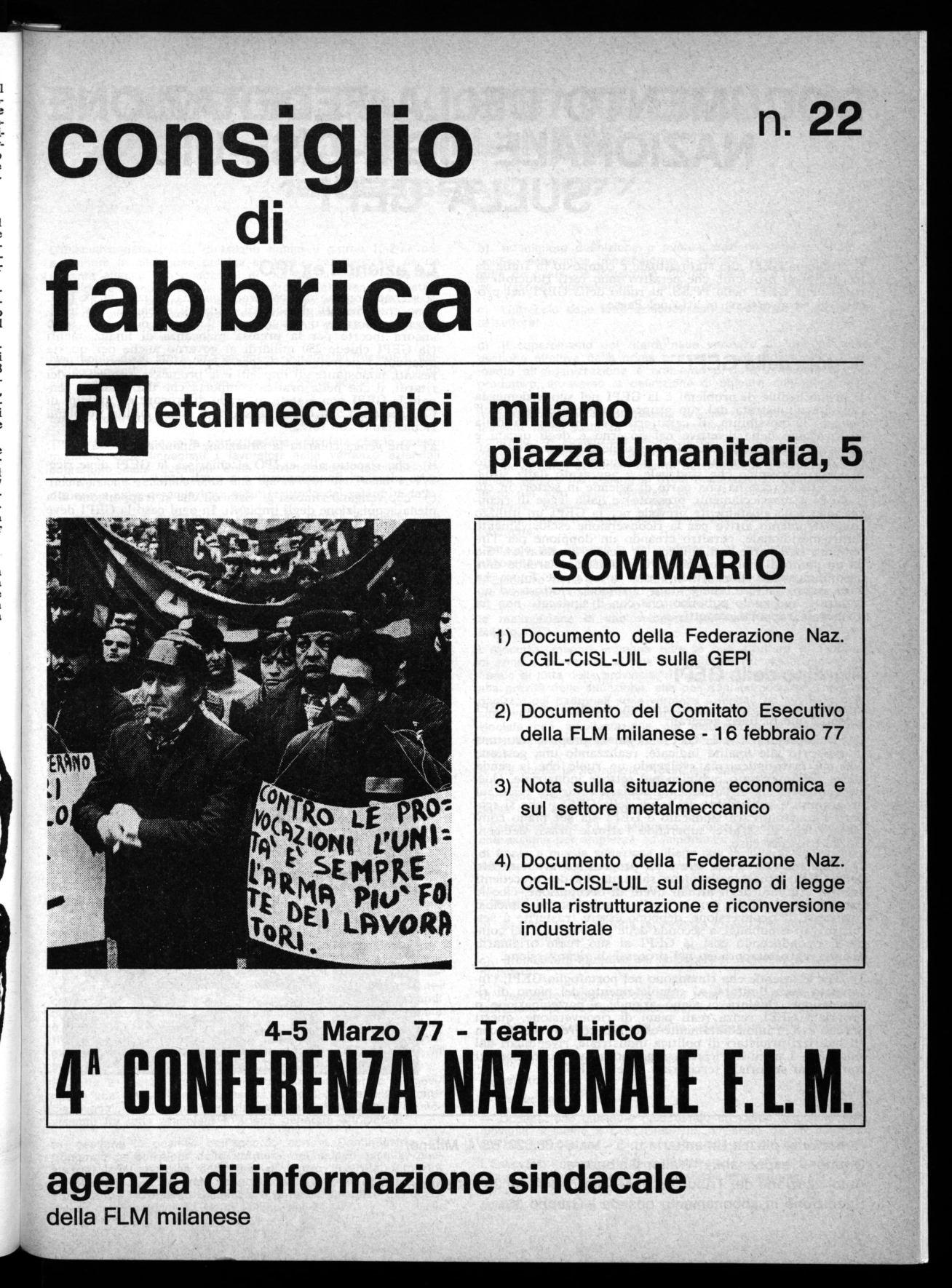 L'Esecutivo della F.L.M. milanese ritiene fondamentale in questo momento l'unificazione della lotta del movimento per cui la F.L.M. proporrà al Direttivo CGIL-CISL-UIL di Milano del 22-2-77, la realizzazione di uno sciopero generale della provincia di Milano.