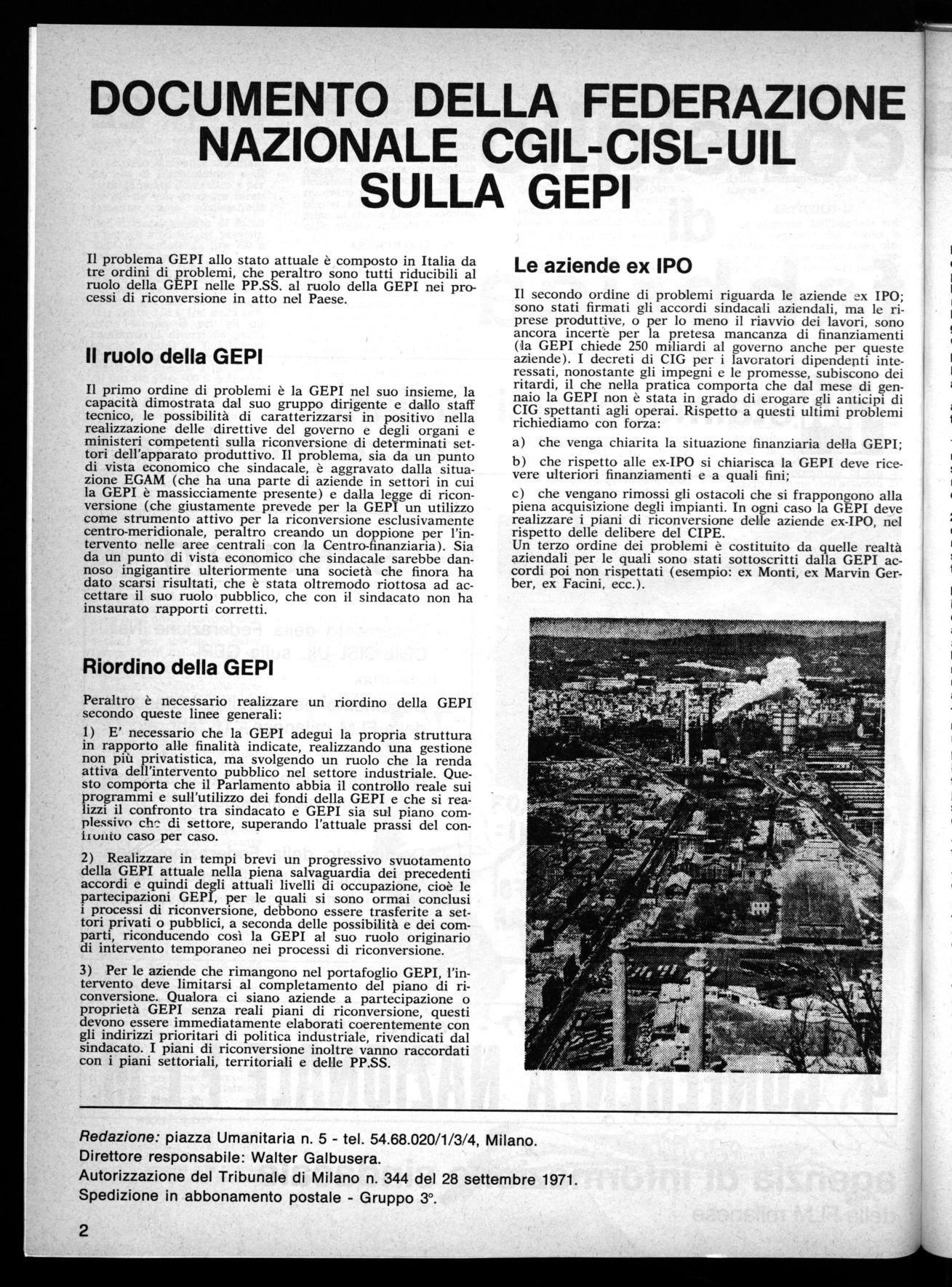 Il secondo ordine di problemi riguarda le aziende ex IPO; sono stati firmati gli accordi sindacali aziendali, ma le riprese produttive, o per lo meno il riavvio dei lavori, sono ancora incerté per la pretesa mancanza di finanziamenti (la GEPI chiede 250 miliardi al governo anche per queste aziende). I decreti di CIG per i lavoratori dipendenti interessati, nonostante gli impegni e le promesse, subiscono dei ritardi, il che nella pratica comporta che dal mese di gennaio la GEPI non è stata in grado di erogare gli anticipi di CIG spettanti agli operai. Rispetto a questi ultimi problemi richiediamo con forza: