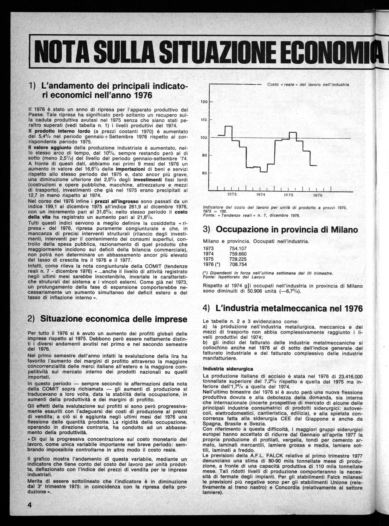 Le pesanti richieste di intervento della Cassa Integrazione Guadagni in alcuni grandi gruppi industriali milanesi, iniziate dalla Falck alla fine di dicembre dello scorso anno e poi seguite da quelle recentissime della Siemens Elettra, della M. Marelli, della Sit Siemens, possono rappresentare l'avvio di una inversione di tendenza rispetto a quello che è stato l'andamento di fondo nel corso del 1976, anno nel quale relativamente ridotto è stato l'intervento della C.I.G. nel complesso della industria metalmeccanica milanese.