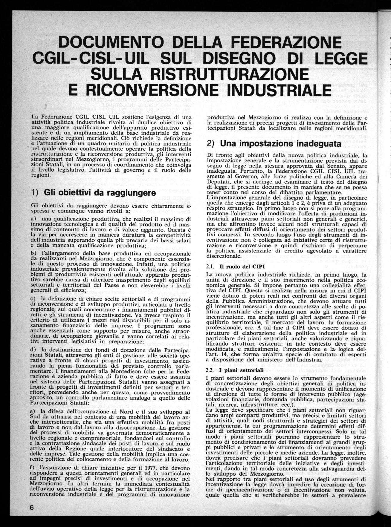 Di fronte agli obiettivi della nuova politica industriale, la impostazione generale e la strumentazione prevista dal disegno di legge nella stesura approvata dal Senato, appare inadeguata. Pertanto, la Federazione CGIL CISL UIL trasmette al Governo, alle forze politiche ed alla Camera dei Deputati, che si accinge ad esaminare il testo del disegno di legge, il presente documento in maniera che se ne possa tener conto nel corso del dibattito parlamentare. L'impostazione generale del disegno di legge, in particolare quella che emerge dagli articoli 1 e 2, è priva di un adeguato respiro strategico. In primo luogo non si pone alla programmazione l'obiettivo di modificare l'offerta di produzioni industriali attraverso piani settoriali non generali e generici, ma che affrontino invece alcuni nodi strutturali capaci di provocare effetti diffusi di orientamento dei settori produttivi connessi. In secondo luogo l'uso degli strumenti di incentivazione non è collegata ad iniziative certe di ristrutturazione e riconversione e quindi rischiano di perpetuare la politica assistenziale di credito agevolato a carattere discrezionale.