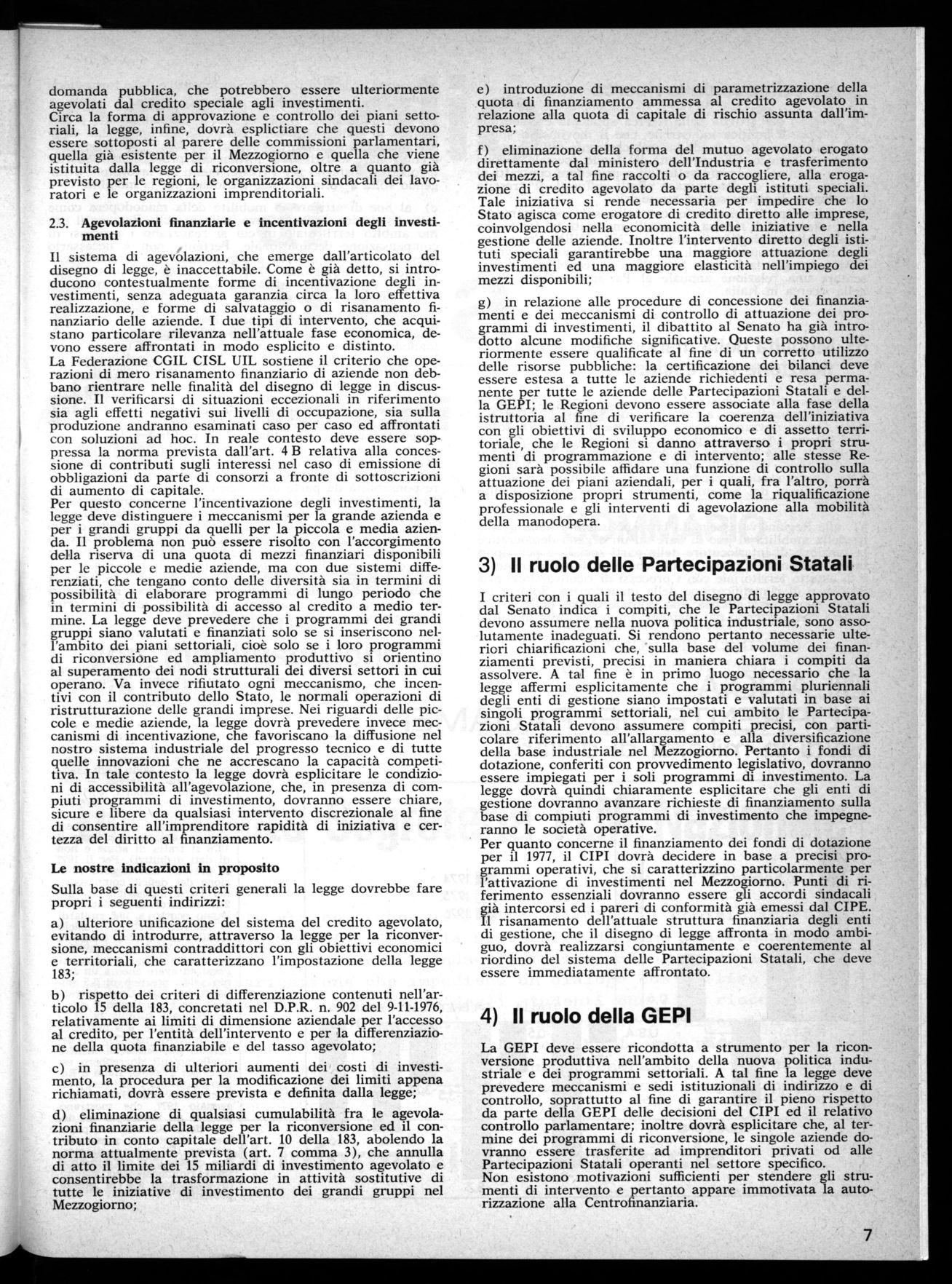 La Federazione CGIL CISL UIL sostiene il criterio che operazioni di mero risanamento finanziario di aziende non debbano rientrare nelle finalità del disegno di legge in discussione. Il verificarsi di situazioni eccezionali in riferimento sia agli effetti negativi sui livelli di occupazione, sia sulla produzione andranno esaminati caso per caso ed affrontati con soluzioni ad hoc. In reale contesto deve essere soppressa la norma prevista dall'art. 4 B relativa alla concessione di contributi sugli interessi nel caso di emissione di obbligazioni da parte di consorzi a fronte di sottoscrizioni di aumento di capitale. Per questo concerne l'incentivazione degli investimenti, la legge deve distinguere i meccanismi per la grande azienda e per i grandi gruppi da quelli per la piccola e media azienda. Il problema non può essere risolto con l'accorgimento della riserva di una quota di mezzi finanziari disponibili per le piccole e medie aziende, ma con due sistemi differenziati, che tengano conto delle diversità sia in termini di possibilità di elaborare programmi di lungo periodo che in termini di possibilità di accesso al credito a medio termine. La legge deve prevedere che i programmi dei grandi gruppi siano valutati e finanziati solo se si inseriscono nell'ambito dei piani settoriali, cioè solo se i loro programmi di riconversione ed ampliamento produttivo si orientino al superamento dei nodi strutturali dei diversi settori in cui operano. Va invece rifiutato ogni meccanismo, che incentivi con il contributo dello Stato, le normali operazioni di ristrutturazione delle grandi imprese. Nei riguardi delle piccole e medie aziende, la legge dovrà prevedere invece meccanismi di incentivazione, che favoriscano la diffusione nel nostro sistema industriale del progresso tecnico e di tutte quelle innovazioni che ne accrescano la capacità competitiva. In tale contesto la legge dovrà esplicitare le condizioni di accessibilità all'agevolazione, che, in presenza di compiuti programmi di investimento, dovranno essere chiare, sicure e libere da qualsiasi intervento discrezionale al fine di consentire all'imprenditore rapidità di iniziativa e certezza del diritto al finanziamento.