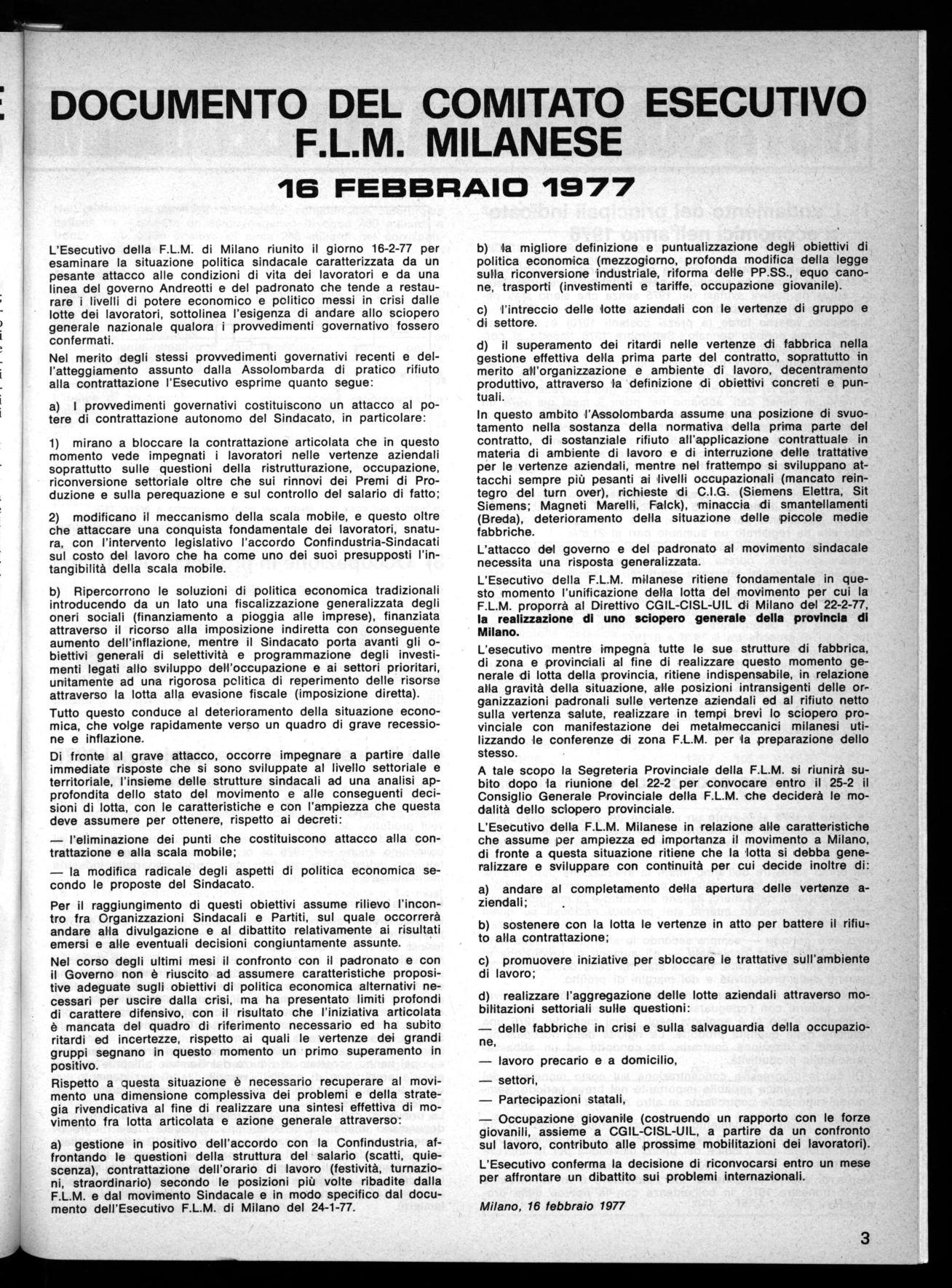 L'Esecutivo della F.L.M. di Milano riunito il giorno 16-2-77 per esaminare la situazione politica sindacale caratterizzata da un pesante attacco alle condizioni di vita dei lavoratori e da una linea del governo Andreotti e del padronato che tende a restaurare i livelli di potere economico e politico messi in crisi dalle lotte dei lavoratori, sottolinea l'esigenza di andare allo sciopero generale nazionale qualora i provvedimenti governativo fossero confermati.