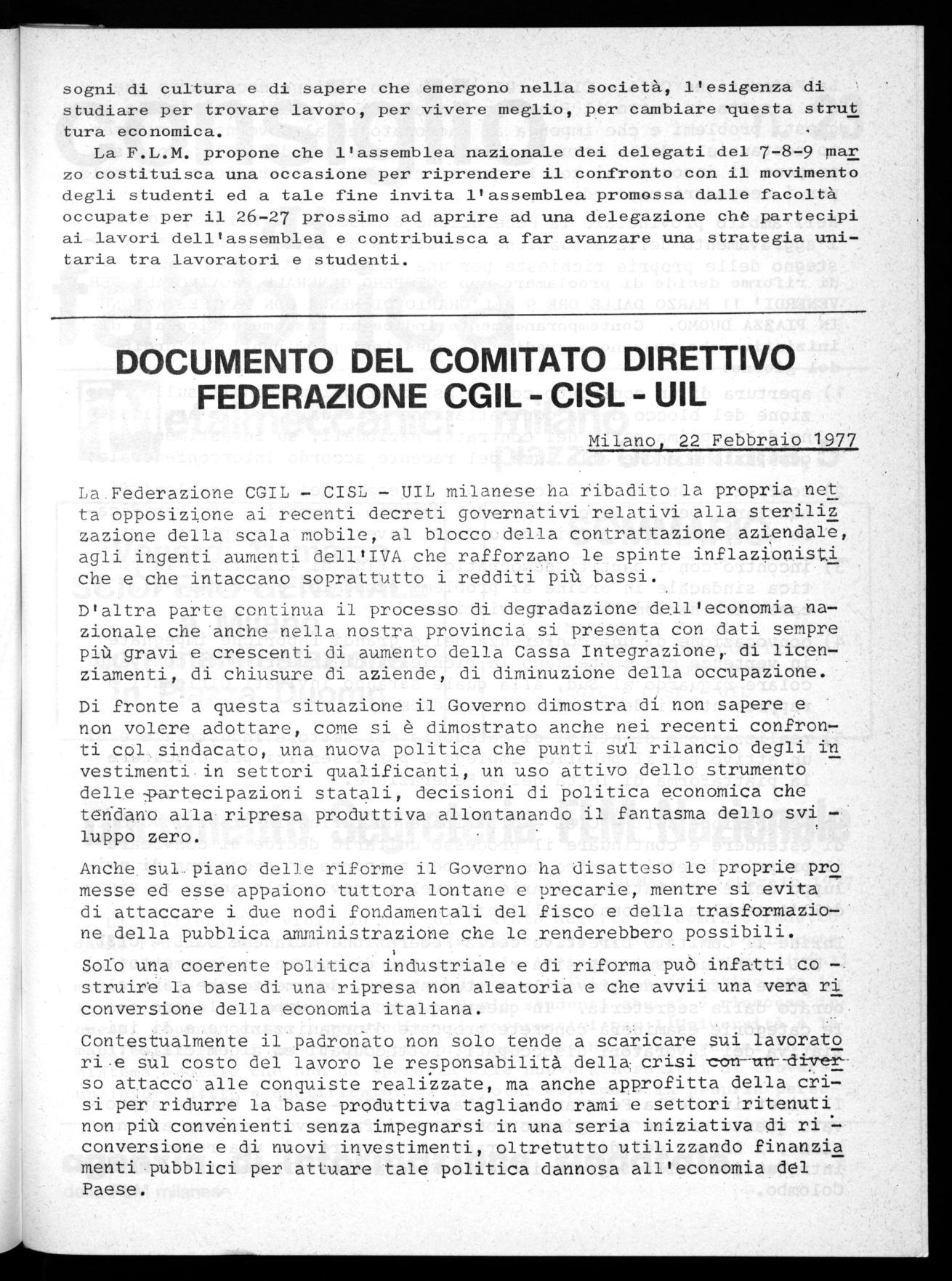 La F.L.M. propone che l'assemblea nazionale dei delegati del 7-8-9 mar zo costituisca una occasione per riprendere il confronto con il movimento degli studenti ed a tale fine invita l'assemblea promessa dalle facoltà occupate per il 26-27 prossimo ad aprire ad una delegazione che partecipi ai lavori dell'assemblea e contribuisca a far avanzare una strategia unitaria tra lavoratori e studenti.
