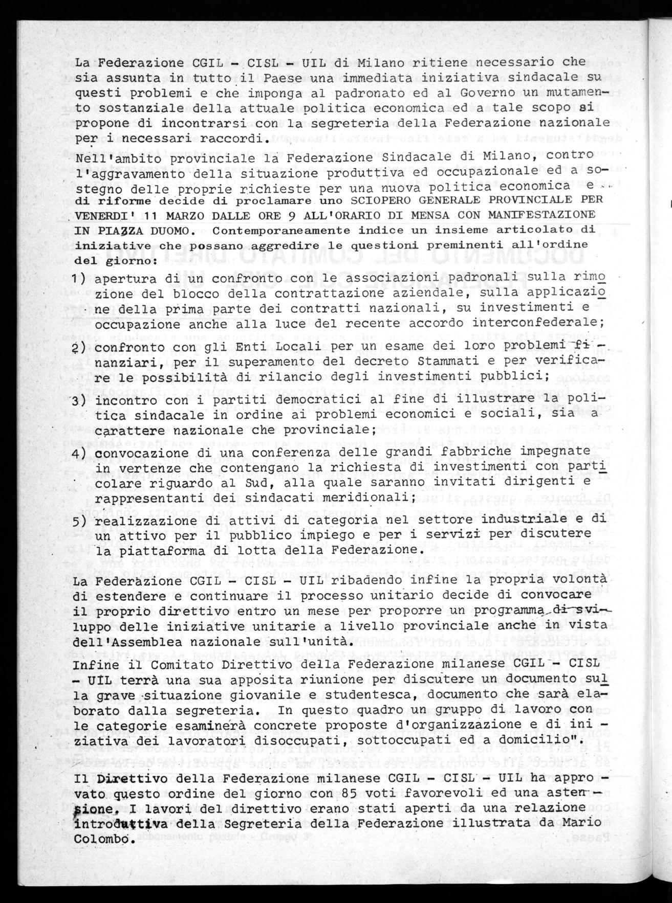 incontro con i partiti democratici al fine di illustrare la poli— tica sindacale in ordine ai problemi economici e sociali, sia a carattere nazionale che provinciale; convocazione di una conferenza delle grandi fabbriche impegnate in vertenze che contengano la richiesta di investimenti con parti colare riguardo al Sud, alla quale saranno invitati dirigenti e rappresentanti dei sindacati meridionali;