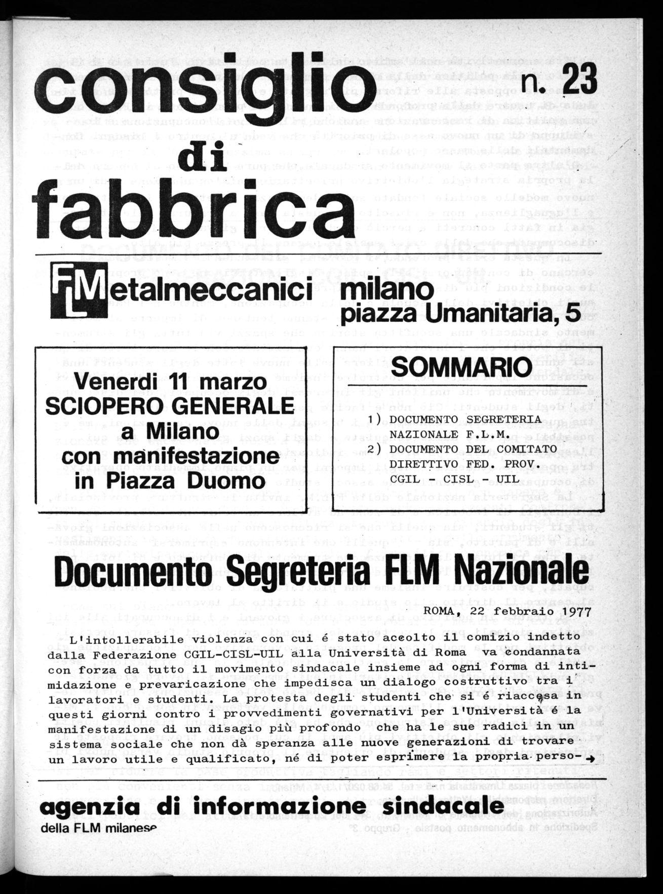 La Segreteria nazionale della F.L.M. invita le strutture provinciali, i Consigli di fabbrica e di zona ad avviare un confronto serrato con tut ti gli studenti, sia quelli che si riconoscnno nelle associazioni giovanili e di partito, sia quelli che intendono esprimersi autonomamente e che rifiutano la violenz omestrumento di confronto e di lotta politica e ad aprire le proprie strutture alle organizzazioni dei disoccupati, per costruire insieme una piattaforma di obiettivi che abbiano al centro il diritto allo studio e il diritto al lavoro.
