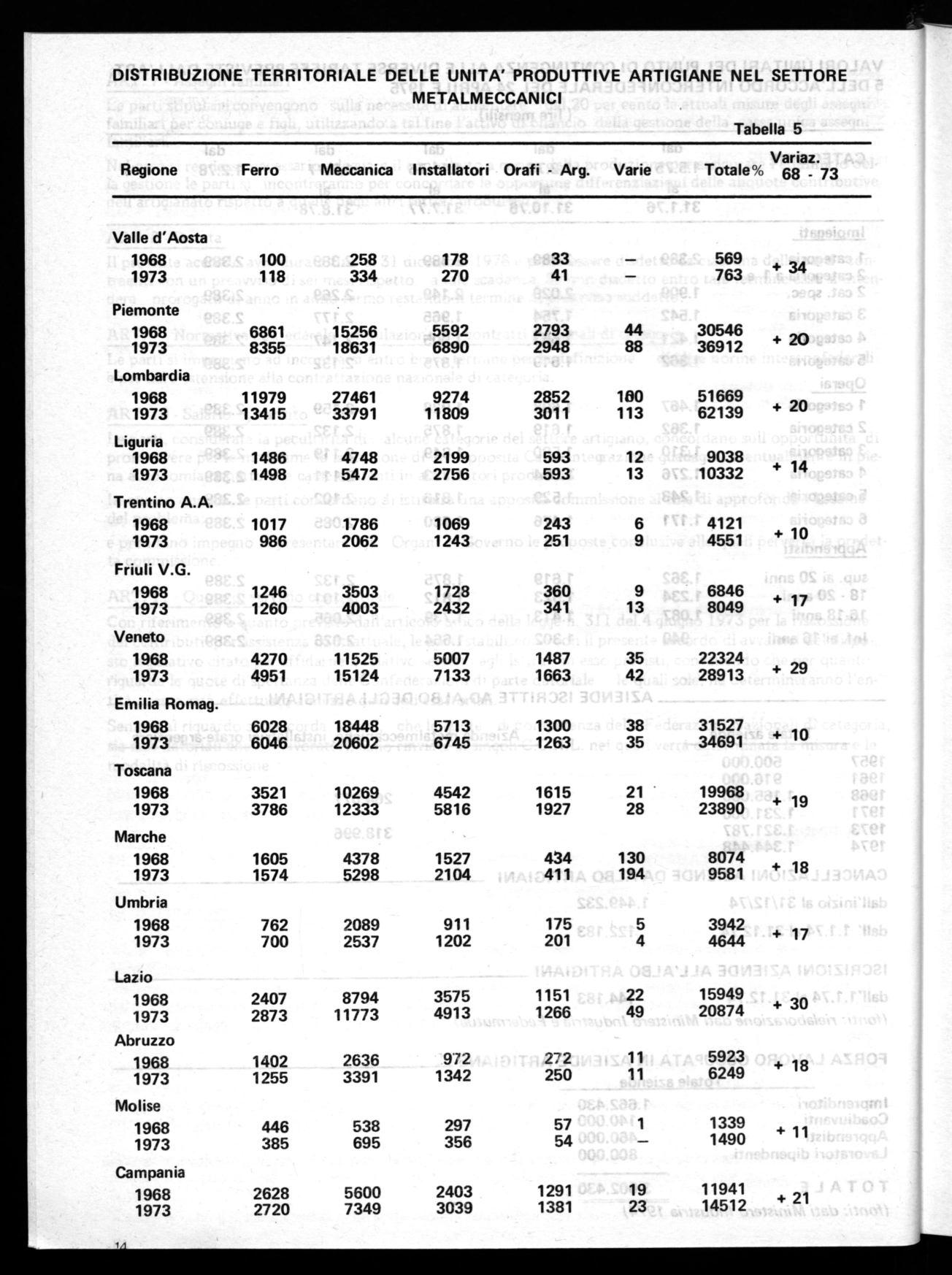 DISTRIBUZIONE TERRITORIALE DELLE UNITA' PRODUTTIVE ARTIGIANE NEL SETTORE METALMECCANICI Tabella 5 Regione Ferro Meccanica Installatori Orafi - Arg. Varie Totale% Variaz. 68 - 73 Valle d'Aosta 1968 1973 100 118 258 334 178 270 33 41 569 763 + 34 Piemonte 1968 6861 15256 5592 2793 44 30546 1973 8355 18631 6890 2948 88 36912 + 2° Lombardia 1968 11979 27461 9274 2852 160 51669 1973 13415 33791 11809 3011 113 62139 + 20 Liguria 1968 1486 4748 2199 593 12 9038 1973 1498 5472 2756 593 13 10332 + 14 Trentino A.A. 1968 1973 1017 986 1786 2062 1069 1243 243 251 6 9 4121 4551 + 10 Friuli V.G. 1968 1973 1246 1260 3503 4003 1728 2432 360 341 9 13 6846 8049 + 17 Veneto 1968 4270 11525 5007 1487 35 22324 1973 4951 15124 7133 1663 42 28913 + 29 Emilia Romag. 1968 1973 6028 6046 18448 20602 5713 6745 1300 1263 38 35 31527 34691 + 10 Toscana 1968 3521 10269 4542 1615 21 19968 1973 3786 12333 5816 1927 28 23890 + 19 Marche 1968 1605 4378 1527 434 130 8074 1973 1574 5298 2104 411 194 9581 + 18 Umbria 1968 762 2089 911 175 5 3942 1973 700 2537 1202 201 4 4644 + 17 Lazio 1968 1973 2407 2873 8794 11773 3575 4913 1151 1266 22 49 15949 20874 + 30 Abruzzo 1968 1973 1402 1255 2636 3391 972 1342 2"2 250 11 11 5923 6249 + 18 Molise 1968 1973 446 385 538 695 297 356 57 54 1 — 1339 1490 + 11 Campania 1968 1973 2628 2720 5600 7349 2403 3039 1291 1381 19 23 11941 14512 + 21 li