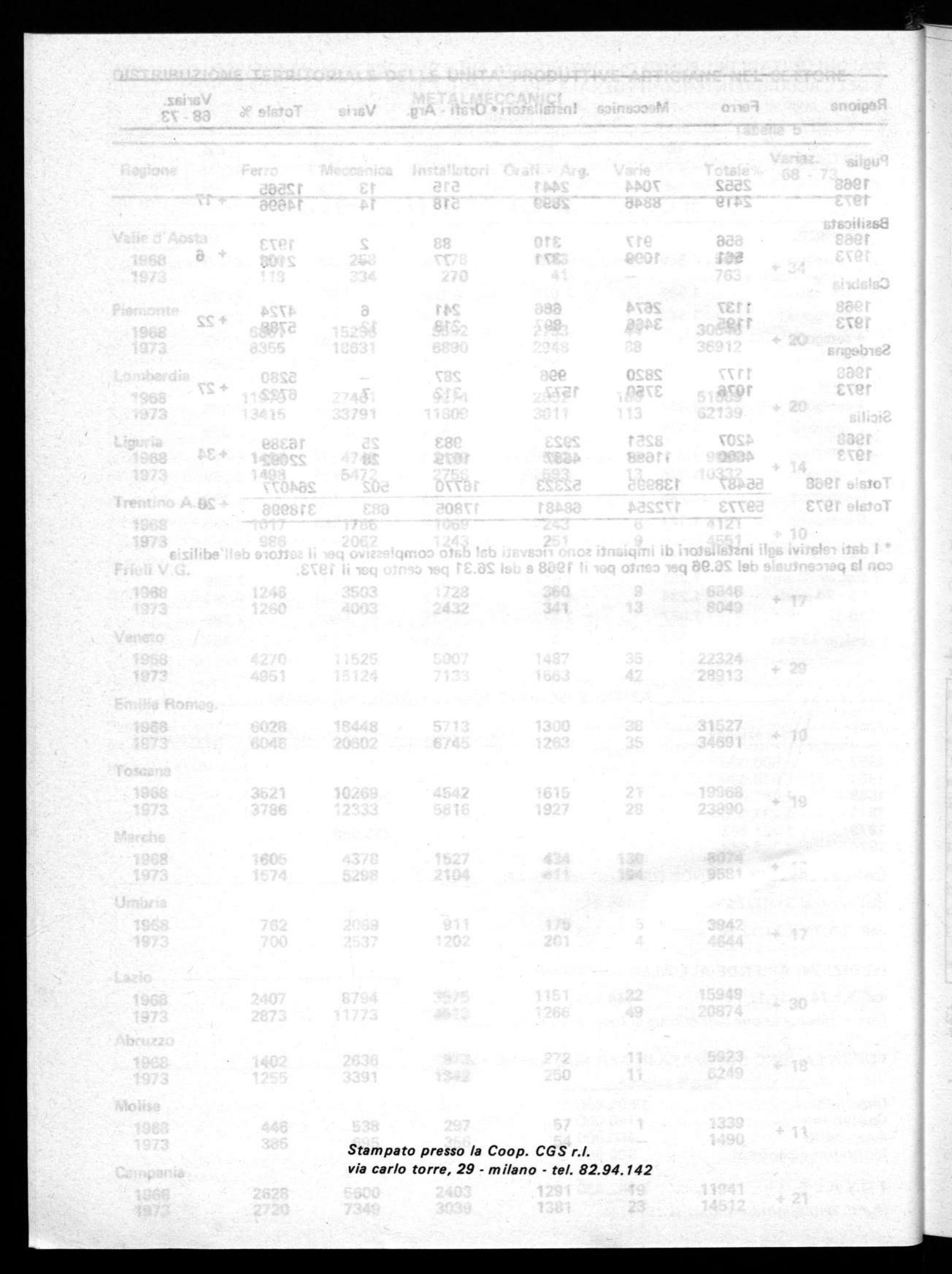 i Regione Ferro Meccanica Installatori * Orafi - Arg. Varie Totale % Variaz. 68 - 73 Puglia 1968 1973 2552 2419 7044 8846 2441 2899 515 518 13 14 12565 14696 + 17 Basilicata 1968 656 917 310 88 2 1973 1973 561 1099 371 77 — 2108 + 6 Calabria 1968 1973 1137 1195 2674 3466 666 897 241 218 6 12 4724 5788 + 22 Sardegna 1968 1973 1177 1076 2820 3750 996 1577 287 312 — 7 5280 6722 + 27 Sicilia 1968 1973 4207 4600 8251 11698 2923 4687 983 1079 25 28 16389 22092 + 34 Totale 1968 55487 138995 52323 16770 502 264077 Totale 1973 59773 172254 68481 17805 683 318996 + 20