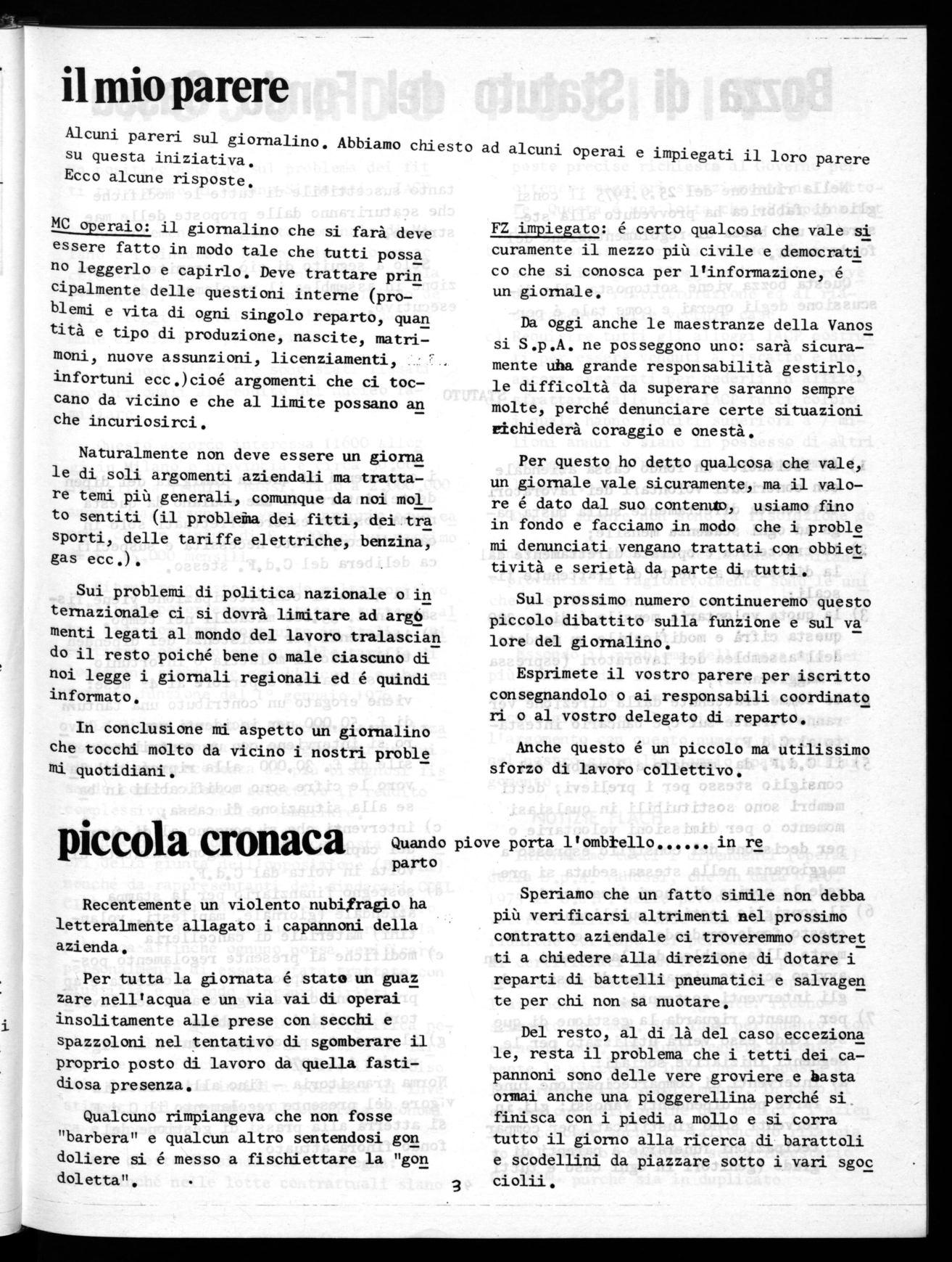 MC operaio: il giornalino che si farà deve essere fatto in modo tale che tutti possa no leggerlo e capirlo. Deve trattare prin cipalmente delle questioni interne (problemi e vita di ogni singolo reparto, quan tità e tipo di produzione, nascite, matrimoni, nuove assunzioni, licenziamenti, infortuni ecc.)cioé argomenti che ci toccano da vicino e che al limite possano an che incuriosirci.