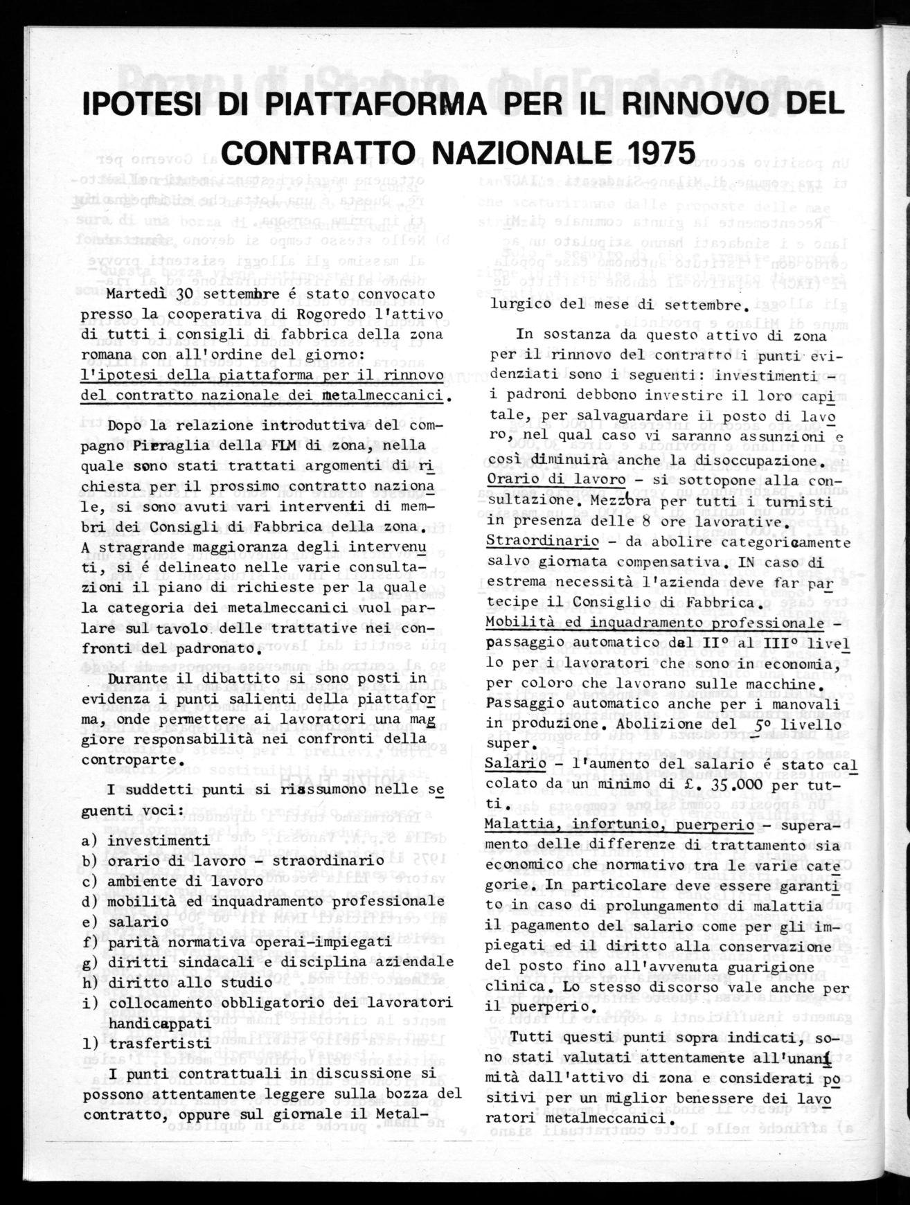 Martedì 30 settembre é stato convocato presso la cooperativa di Rogoredo l'attivo di tutti i consigli di fabbrica della zona romana con all'ordine del giorno: l'ipotesi della piattaforma per il rinnovo del contratto nazionale dei metalmeccanici