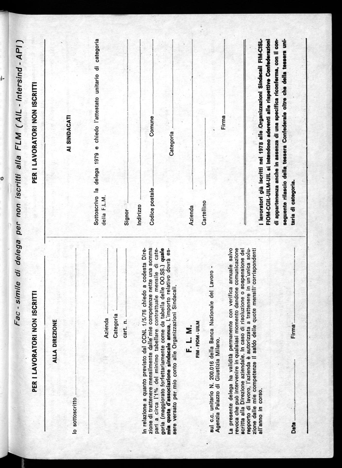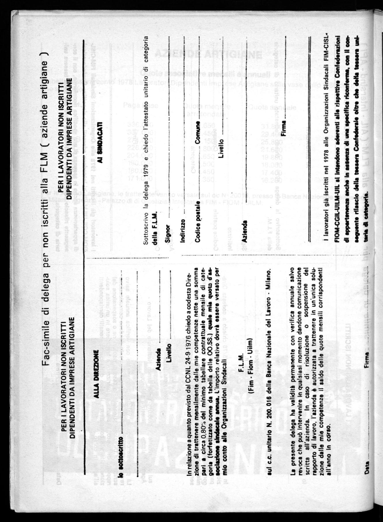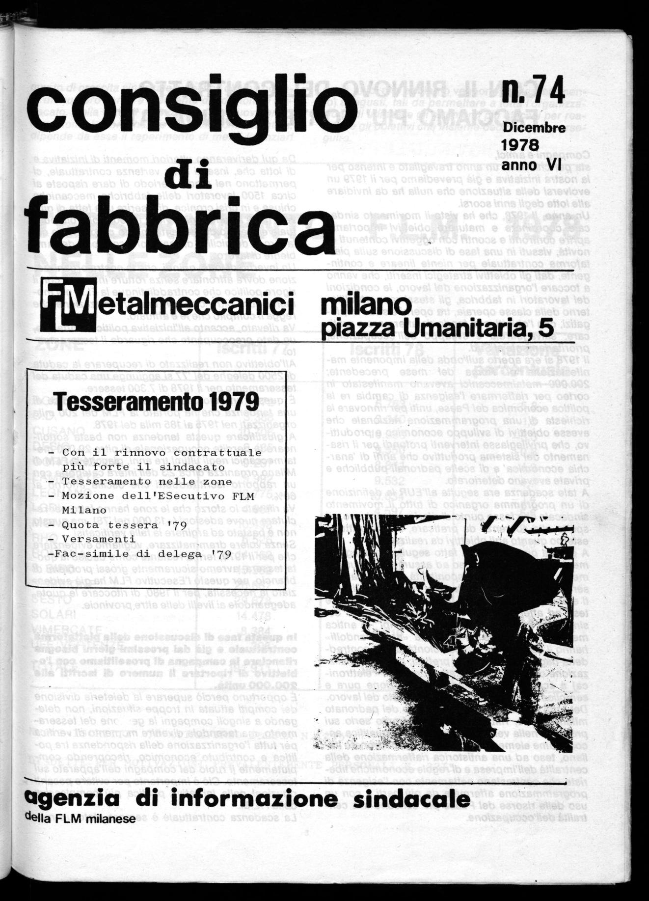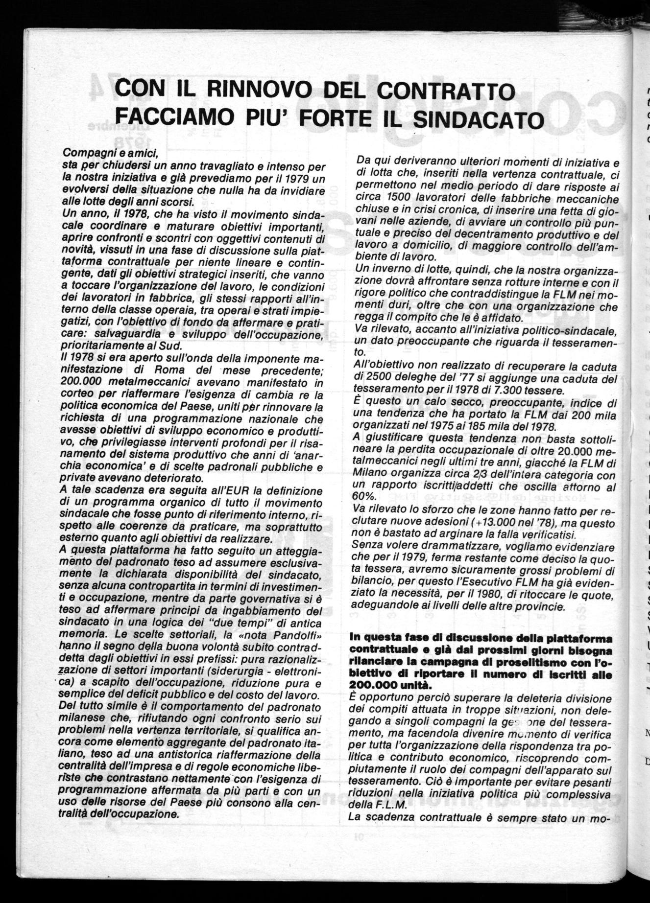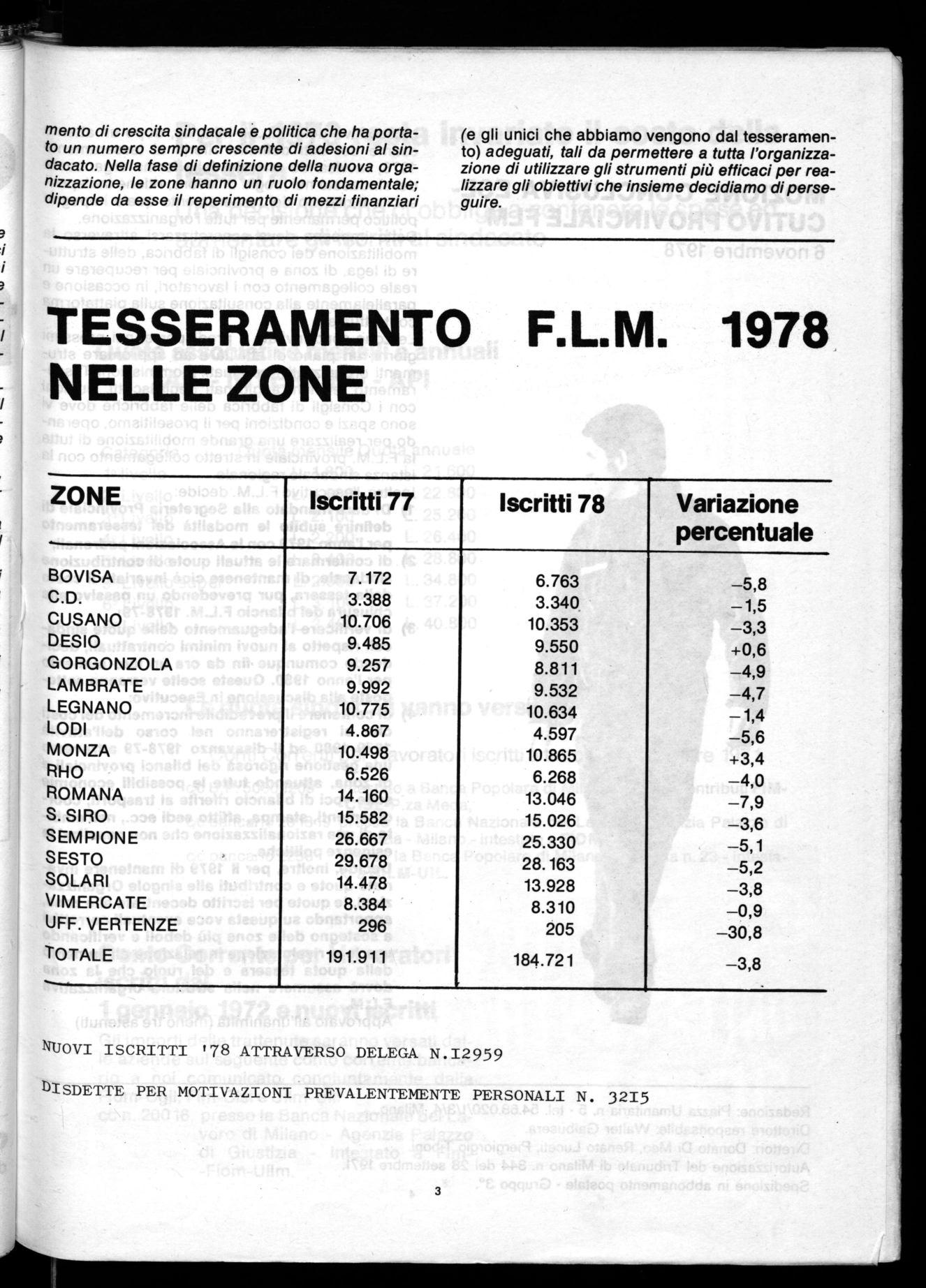 L'Esecutivo della F.L.M. Milanse, dopo un attento esame dei dati definitivi riferiti al tesseramento 1978, ravvisando un calo della forma organizzata del sindacato nei luoghi di lavoro, ritiene indispensabile il rilancio del tesseramento quale impegno politico permanente per tutta l'organizzazione. Detto impegno deve concretizzarsi attraverso la mobilitazione dei consigli di fabbrica, delle strutture di lega, di zona e provinciale per recuperare un reale collegamento con i lavoratori, in occasione e parallelamente alla consultazione sulla piattaforma contrattuale.