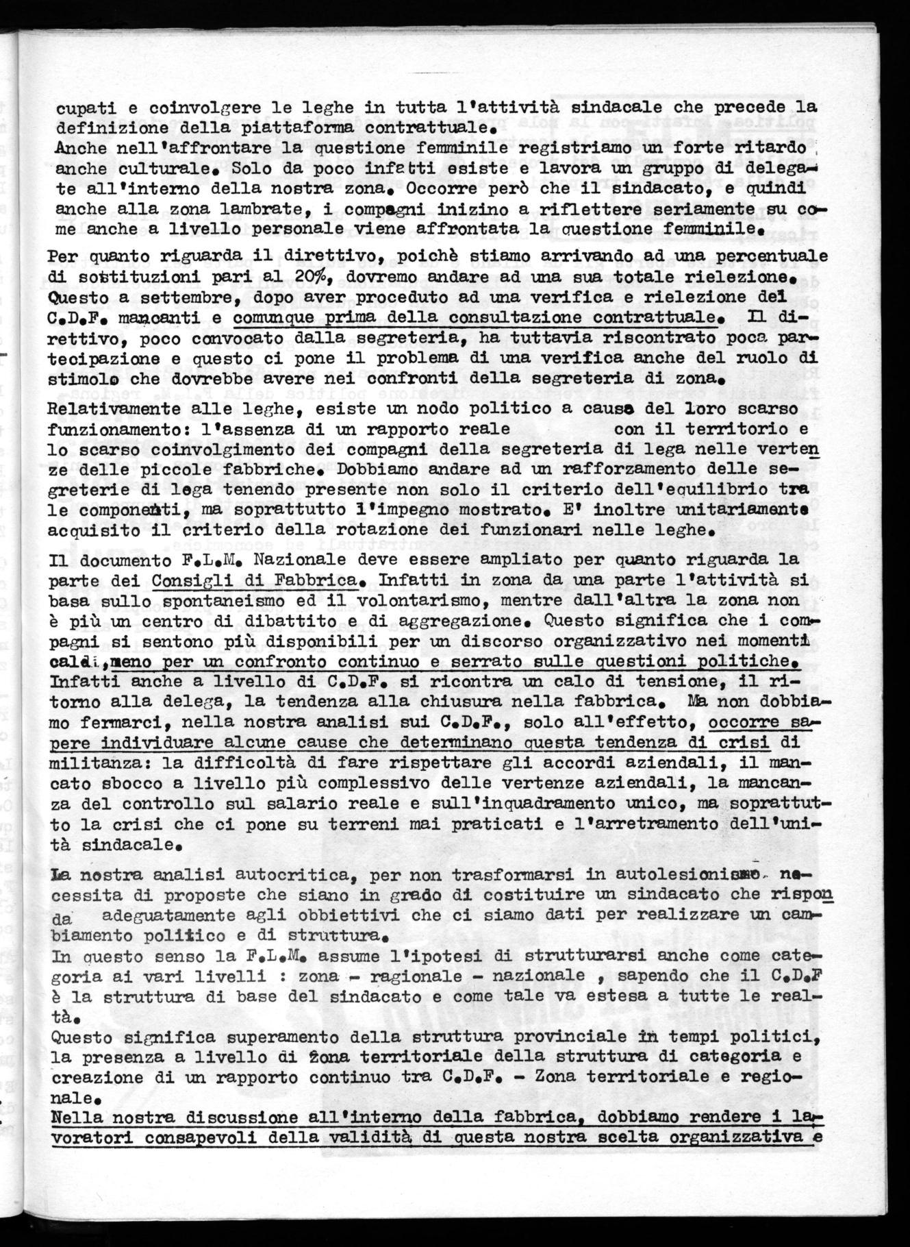Il documento F.L.M. Nazionale deve essere ampliato per quanto riguarda la parte dei Consigli di Fabbrica. Infatti in zona da una parte l'attività si basa sullo spontaneismo ed il volontarismo, mentre dall'altra la zona non è più un centro di dibattito e di aggregazione. Questo significa che i com. pegni si sentono più disponibili per un discorso organizzativo nei momenti cald,meno per un confronto continuo e serrato sulle questioni politiche. Infatti anche a livello di C.D.F. si ricontra un calo di tensione, il ritorno alla delega, la tendenza alla chiusura nella fabbrica. Ma non dobbiamo fermarci, nella nostra analisi sui C.D.F., solo all'effetto, occorre sapere individuare alcune cause che determinano questa tendenza di crisi di militanza: la difficoltà di fare rispettare gli accordi aziendali, il mancato sbocco a livello più complessivo delle vertenze aziendali, la mancanza del controllo sul salario reale e sull'inquadramento unico, ma soprattutto la crisi che ci pone su terreni mai praticati e l'arretramento dell'unità sindacale.