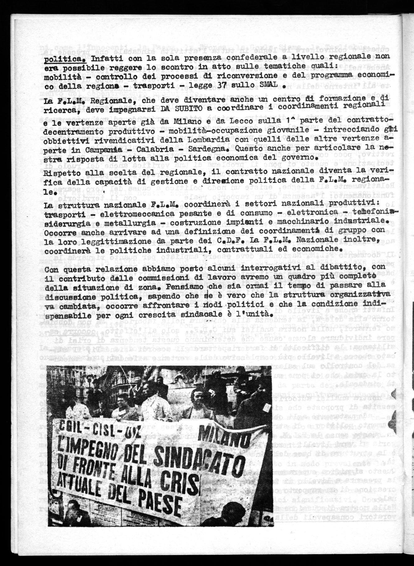 La F.L.M. Regionale, che deve diventare anche un centro di formazione e di ricerca, deve impegnarsi DA SUBITO a coordinare i coordinamenti regionali e le vertenze aperte già da Milano e da Lecco sulla 1" parte del contrattodecentramento produttivo - mobilità -occupazione giovanile - intrecciando gbi obbiettivi rivendicativi della Lombardia con quelli delle altre vertenze aperte in Campania - Calabria - Sardegna. Questo anche per articolare la nostra risposta di lotta alla politica economica del governo.