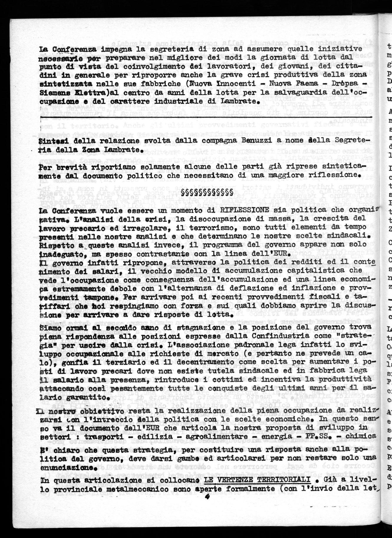 la Conferenza impegna la segreteria di zona ad assumere quelle iniziative neoessarie per preparare nel migliore dei modi la giornata di lotta dal punto di vista del coinvolgimento dei lavoratori, dei giovani, dei cittadini in generale per riproporre anche la grave crisi produttiva della zona sintetizzata nelle sue fabbriche (Nuova Innocenti - Nuova Paema - DrbpsaSiemens Elettra)al centro da anni della lotta per la salvaguardia dell'occupazione e del carattere industriale di Lambrate.