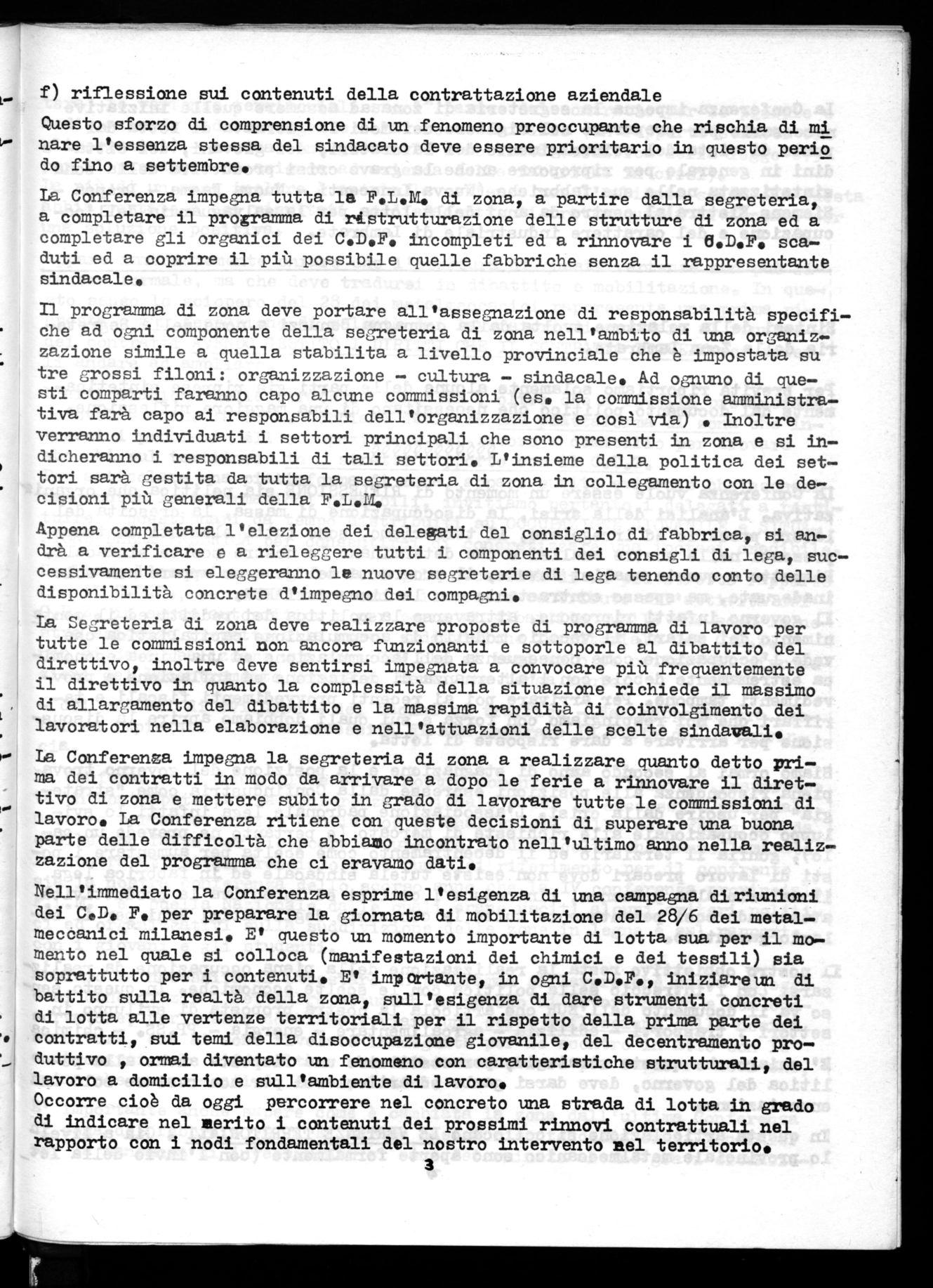 Nell'immediato la Conferenza esprime l'esigenza di una campagna di riunioni dei Ce.D. F. per preparare la giornata di mobilitazione del 28/6 dei metalmeccanici milanesi. E' questo un momento importante di lotta sua per il momento nel quale si colloca (manifestazioni dei chimici e dei tessili) sia soprattutto per i contenuti. E' importante, in ogni C.D.F., iniziare un di battito sulla realtà della zona, sull'esigenza di dare strumenti concreti di lotta alle vertenze territoriali per il rispetto della prima parte dei contratti, sui temi della disoccupazione giovanile, del decentramento pro, duttivo , ormai diventato un fenomeno con caratteristiche strutturali, del lavoro a domicilio e sull'ambiente di lavoro.