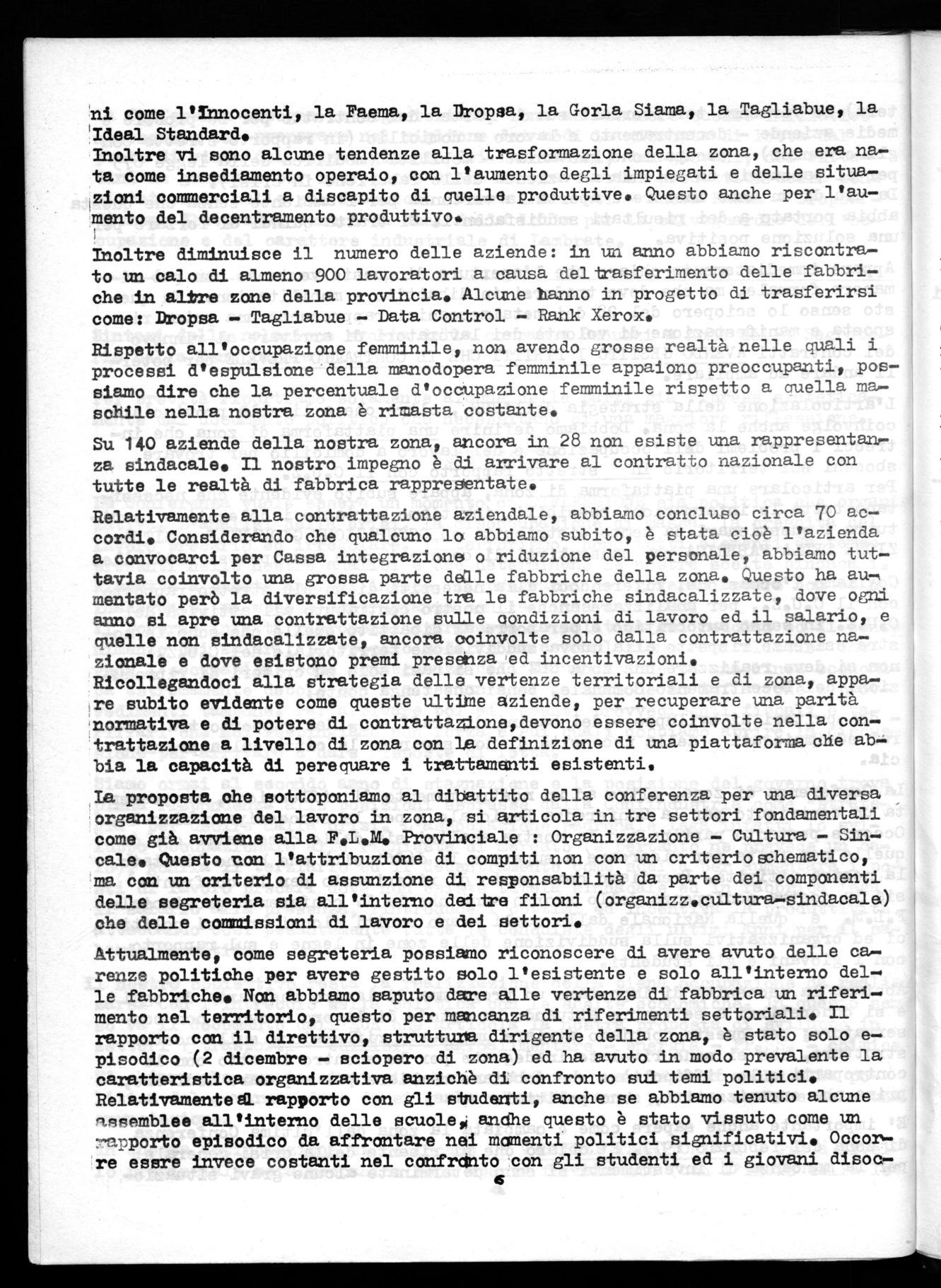 Attualmente, come segreteria possiamo riconoscere di avere avuto delle carenze politiche per avere gestito solo l'esistente e solo all'interno del-. le fabbriche. Non abbiamo saputo dare alle vertenze di fabbrica un riferimento nel territorio, questo per mancanza di riferimenti settoriali. Il rapporto con il direttivo, strutture dirigente della zona, è stato solo episodico (2 dicembre - sciopero di zona) ed ha avuto in modo prevalente la caratteristica organizzativa anzichè di confronto sui temi politici.