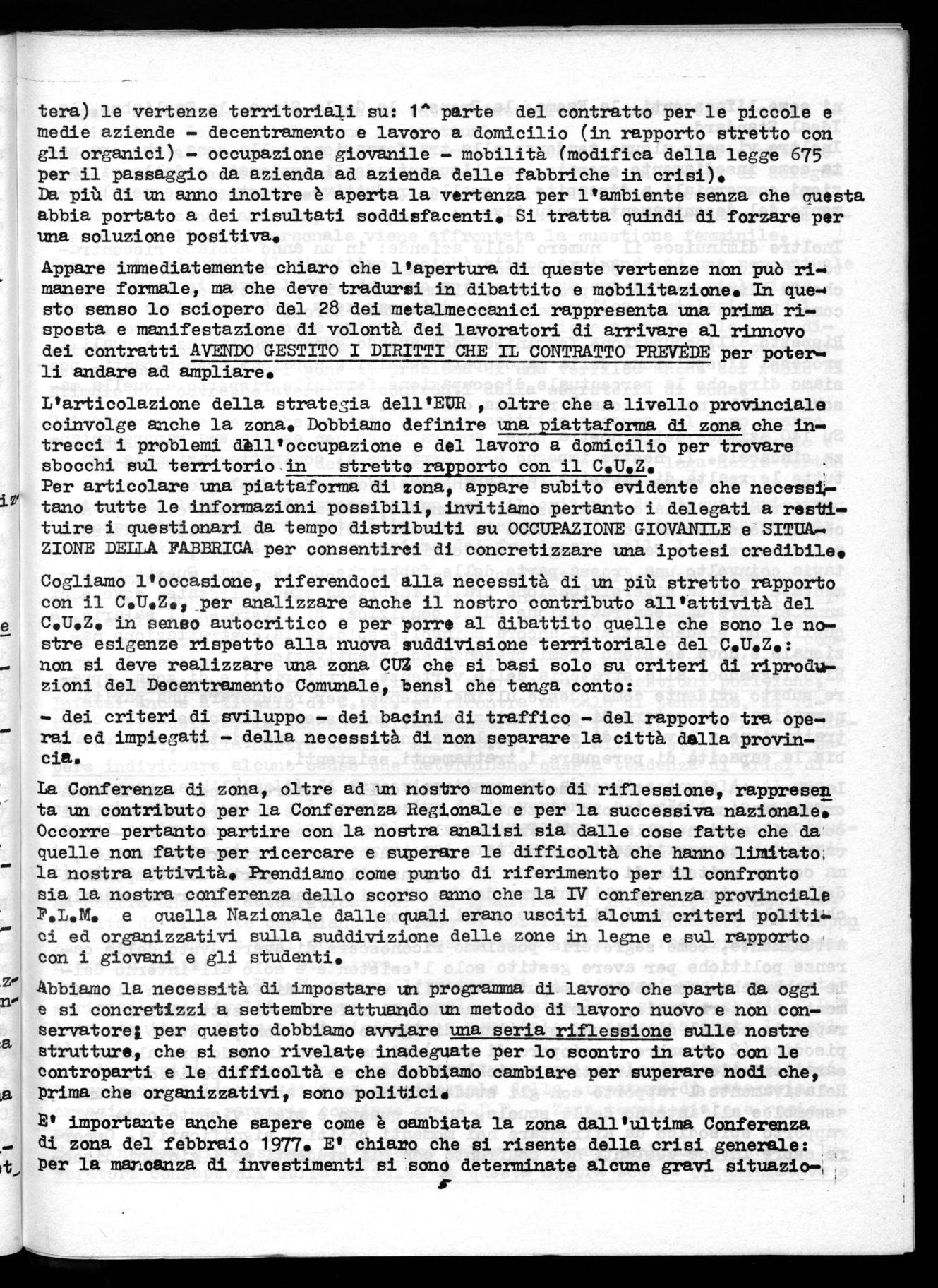 Abbiamo la necessità di impostare un programma di lavoro che parta da oggi e si concretizzi a settembre attuando un metodo di lavoro nuovo e non conservatore; per questo dobbiamo avviare una seria riflessione sulle nostre strutture, che si sono rivelate inadeguate per lo scontro in atto con le controparti e le difficoltà e che dobbiamo cambiare per superare nodi che, prima che organizzativi, sono politici« importante anche sapere come è cambiata la zona dall'ultima Conferenza di zona del febbraio 1977. E' chiaro che si risente della crisi generale: