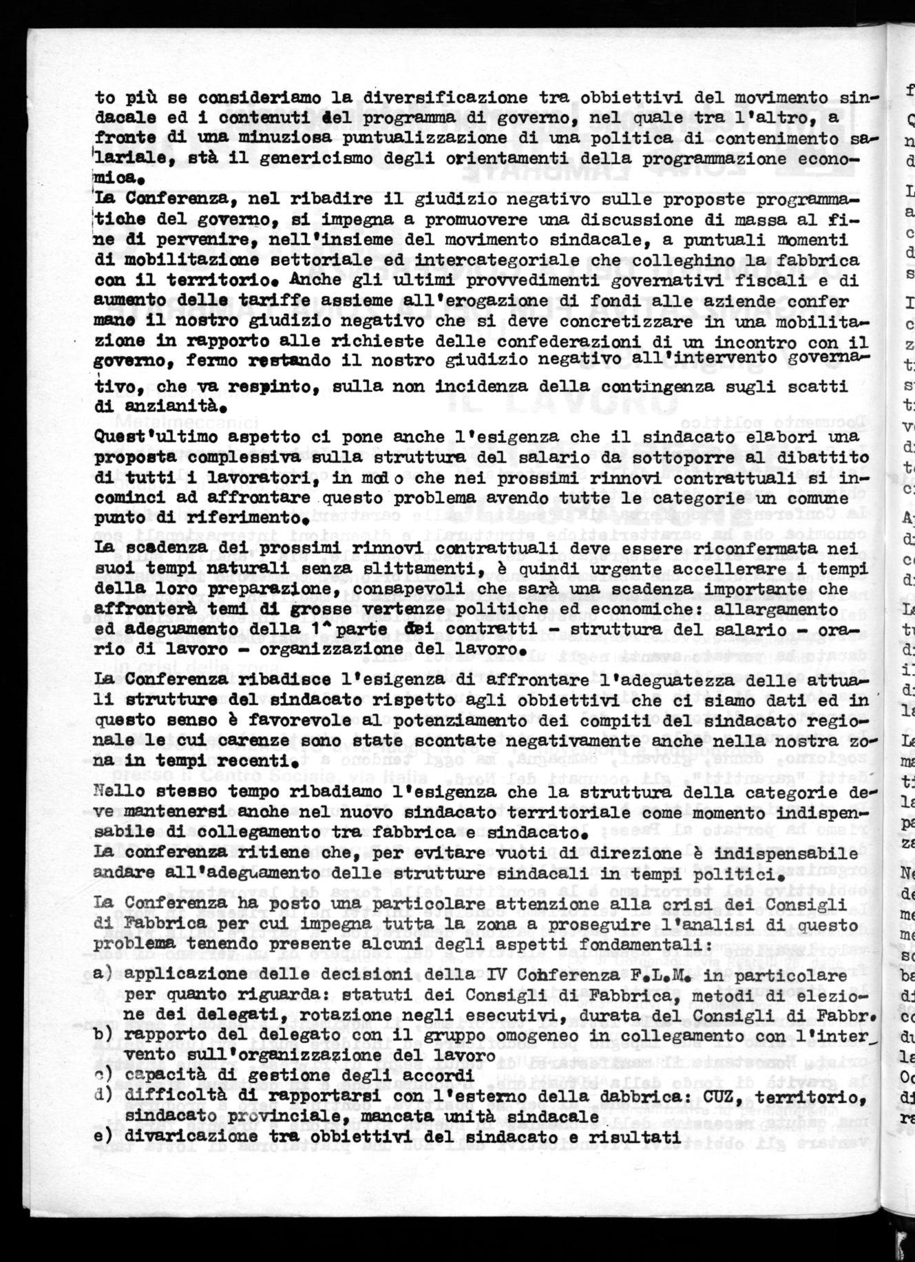 La Conferenza ha posto una particolare attenzione alla crisi dei Consigli d( mE di Fabbrica per cui impegna tutta la zana a proseguire l'analisi di questo m( problema tenendo presente alcuni degli aspetti fondamentali: sc