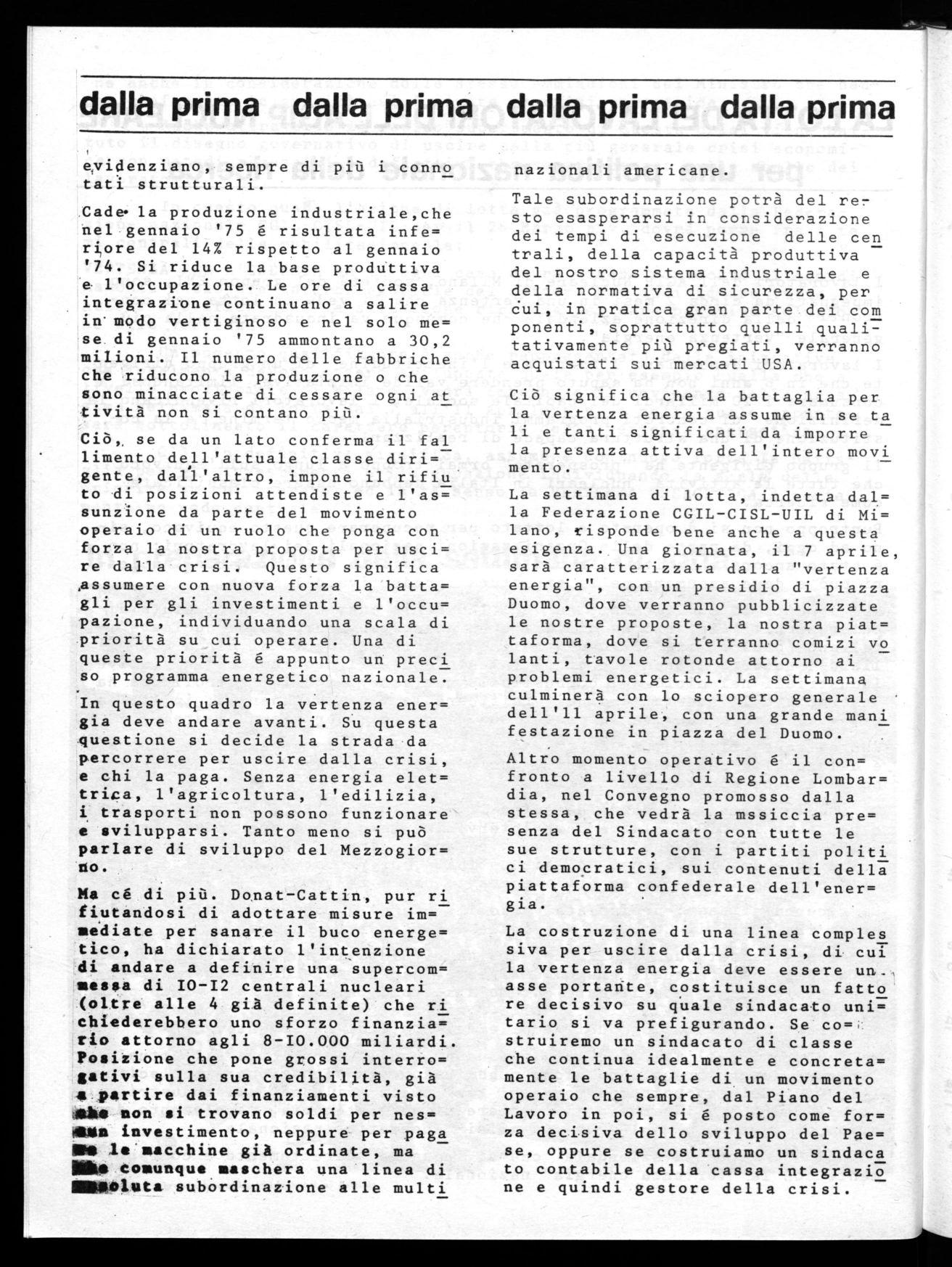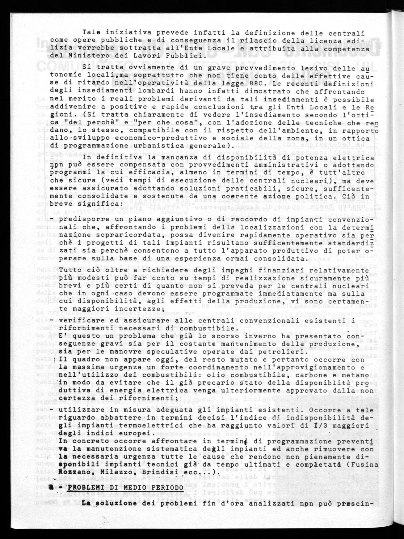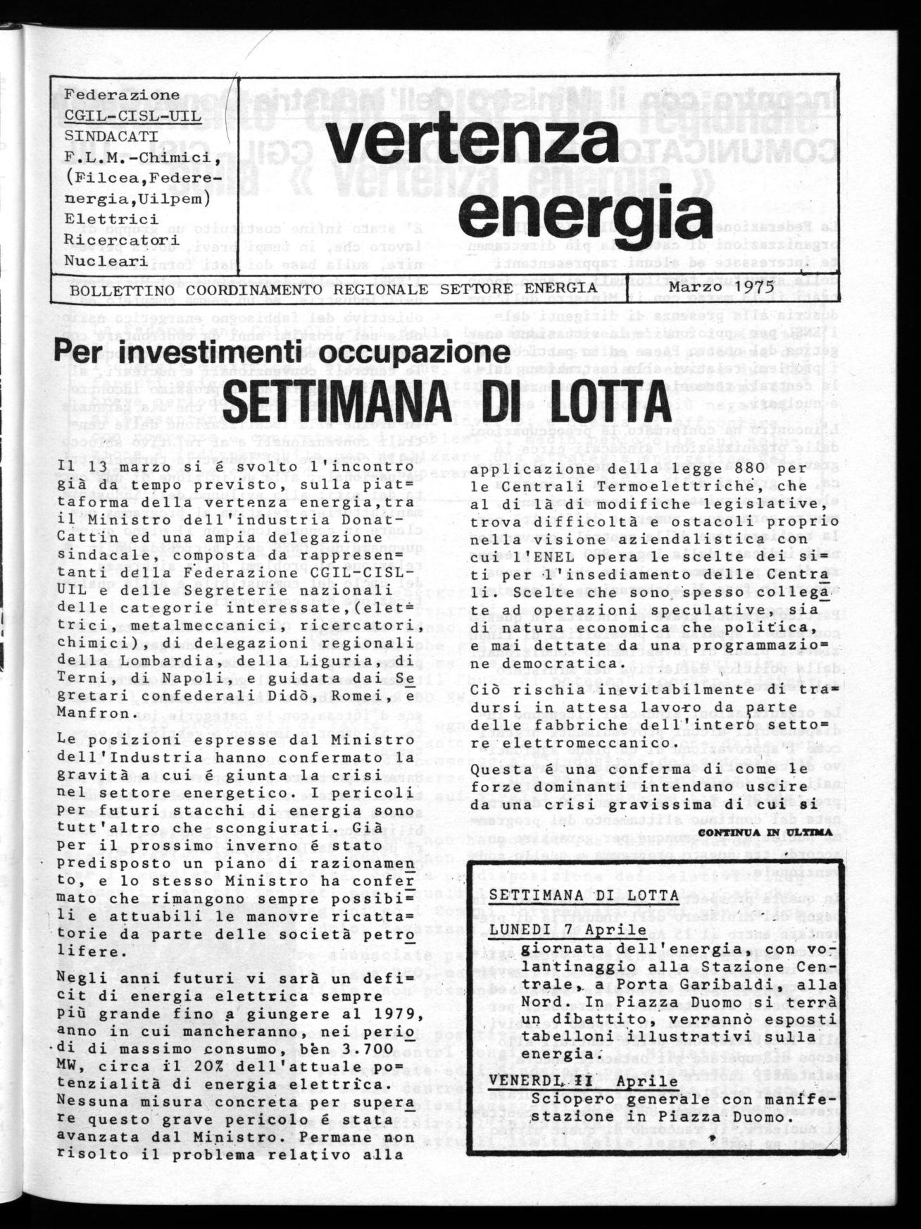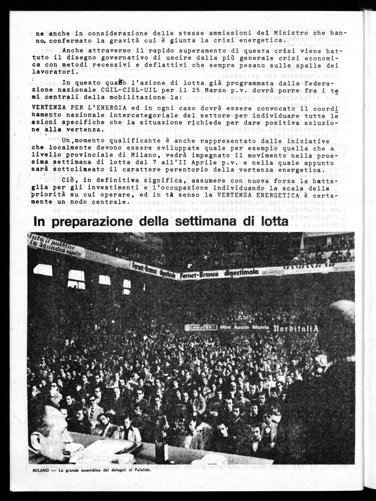 Un,momento qualificante è anche rappresentato dalle iniziative che localmente devono essere sviluppate quale per esempio quella che a livello provinciale di Milano, vedrà impegnato il movimento nella prossima settimana di lotta dal 7 all'Il Aprile p.v. e nella quale appunto sarà sottolineato il carattere perentorio della vertenza energetica.