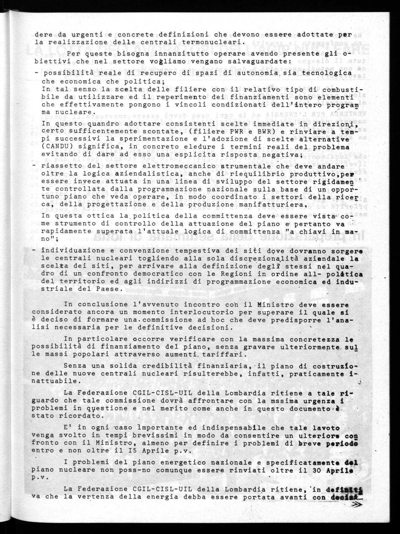 Altro momento operativo é il con= fronto a livello di Regione Lombar= dia, nel Convegno promosso dalla stessa, che vedrà la mssiccía pre= senza del Sindacato con tutte le sue strutture, con i partiti politi ci democratici, sui contenuti della piattaforma confederale dell'ener= gia.