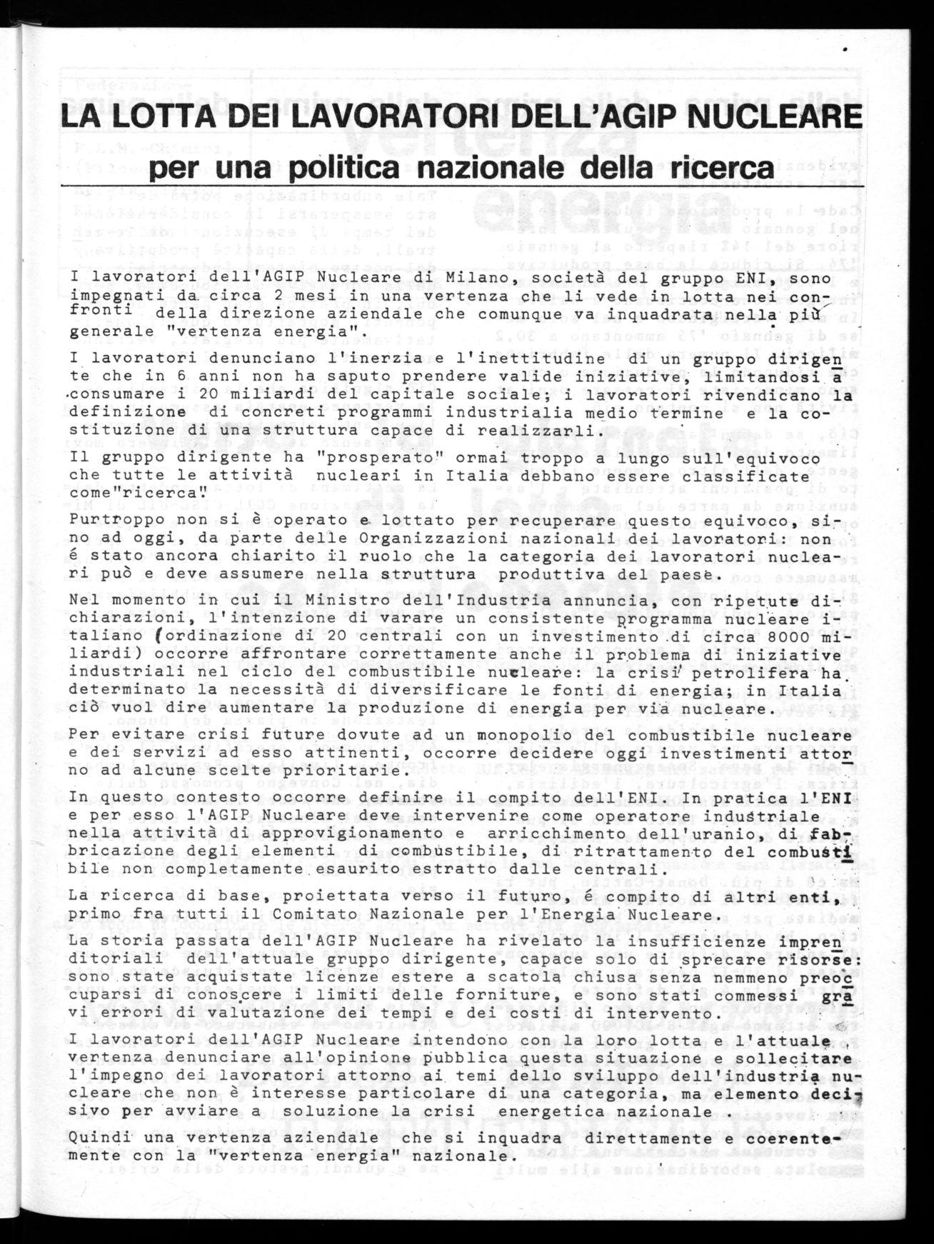 I lavoratori dell'AGIP Nucleare intendono con la loro lotta e l'attuale , vertenza denunciare all'opinione pubblica questa situazione e sollecitare l'impegno dei lavoratori attorno ai temi dello sviluppo dell'industria nucleare che non è interesse particolare di una categoria, ma elemento deci, sivo per avviare a soluzione la crisi energetica nazionale .