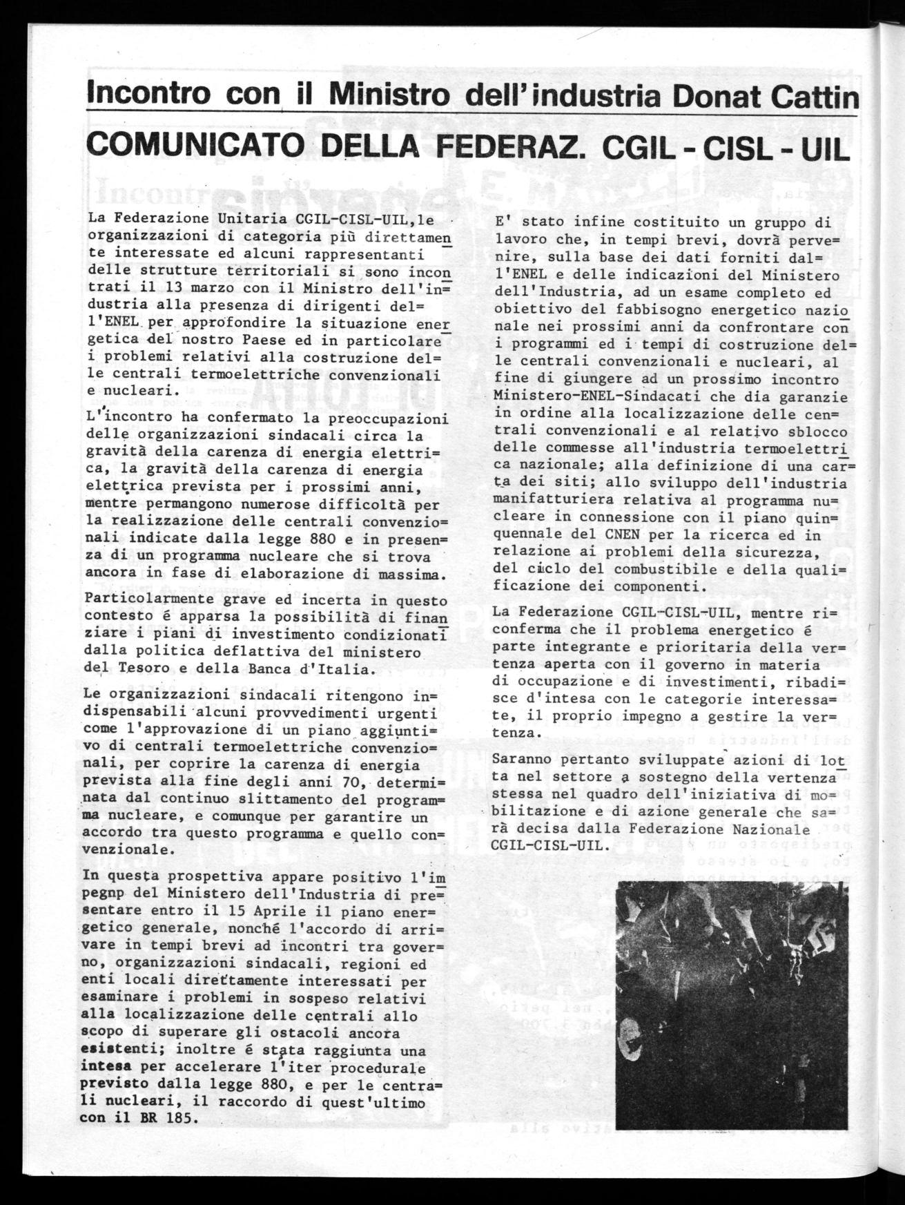 Il 13 marzo si é svolto l'incontro già da tempo previsto, sulla piat= taforma della vertenza energia,tra il Ministro dell'industria DonatCattin ed una ampia delegazione sindacale, composta da rappresen= tanti della Federazione CGIL-CISLUIL e delle Segreterie nazionali delle categorie interessate,(elet= tríci, metalmeccanici, ricercatori chimici), di delegazioni regionali della Lombardia, della Liguria, di Terni, di Napoli, e guidata dai Se gretari confederali Didò, Romei, Manfron.