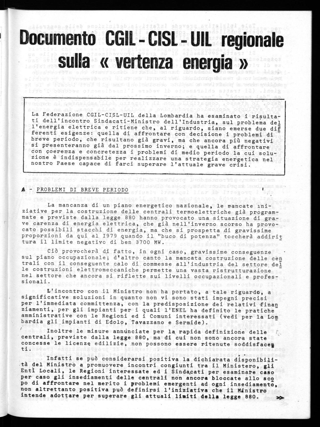La Federazione CGIL-CISL-UIL della Lombardia ha esaminato i risultati dell'incontro Sindacati-Ministro dell'Industria, sul problema del l'energia elettrica e ritiene che, al riguardo, siano emerse due dif ferenti esigenze: quella di affrontare con decisione i problemi dibreve periodo, che risultano già gravi, ma che ancora più negativi si presenteranno già dal prossimo inverno; e quella di affrontare con coerenza e concretezza i problemi di medio periodo la cui soluzione è indispensabile per realizzare una strategia energetica nel nostro Paese capace di farci superare l'attuale grave crisi.