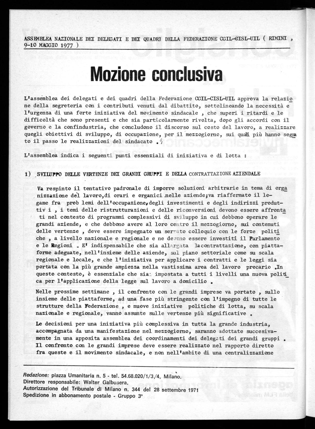 Le decisioni per una iniziativa più complessiva in tutta la grande industria, accompagnata da una manifestazione nel mezzogiorno, saranno adottate succesivamente in una apposita assemblea dei coordinamenti dei delegati dei grandi gruppi Il confronto con le grandi imprese deve essere realizzato nel rapporto diretto fra queste e il movimento sindacale, e non nell'ambito di una centralizzazione