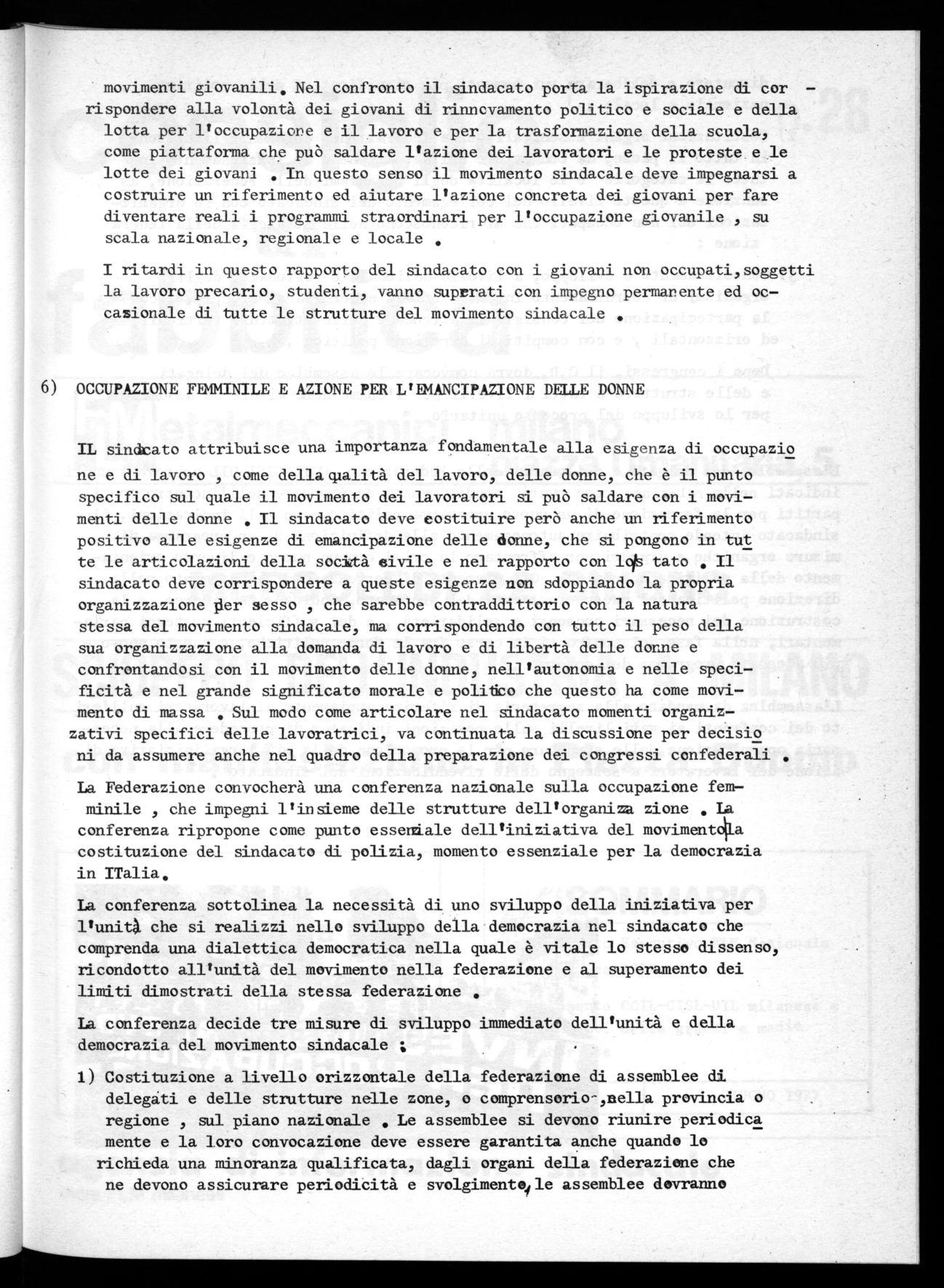 IL sindcato attribuisce una importanza fondamentale alla esigenza di occupazio ne e di lavoro , come della qualità del lavoro, delle donne, che è il punto specifico sul quale il movimento dei lavoratori si può saldare con i movi— menti delle donne . Il sindacato deve costituire però anche un riferimento positivo alle esigenze di emancipazione delle donne, che si pongono in tut te le articolazioni della socità civile e nel rapporto con 19's tato . Il sindacato deve corrispondere a queste esigenze non sdoppiando la propria organizzazione Pier sesso , che sarebbe contraddittorio con la natura stessa del movimento sindacale, ma corrispondendo con tutto il peso della sua organizzazione alla domanda di lavoro e di libertà delle donne e confrontandosi con il movimento delle donne, nell'autonomia e nelle speci— ficità e nel grande significato morale e politico che questo ha come movi— mento di massa Sul modo come articolare nel sindacato momenti organiz— zativi specifici delle lavoratrici, va continuata la discussione per decisio ni da assumere anche nel quadro della preparazione dei congressi confederali La Federazione convocherà una conferenza nazionale sulla occupazione fem— minile , che impegni l'insieme delle strutture dell'organiza zione La conferenza ripropone come punto esseniale dell'iniziativa del movimentdpLa costituzione del sindacato di polizia, momento essenziale per la democrazia in ITalia.