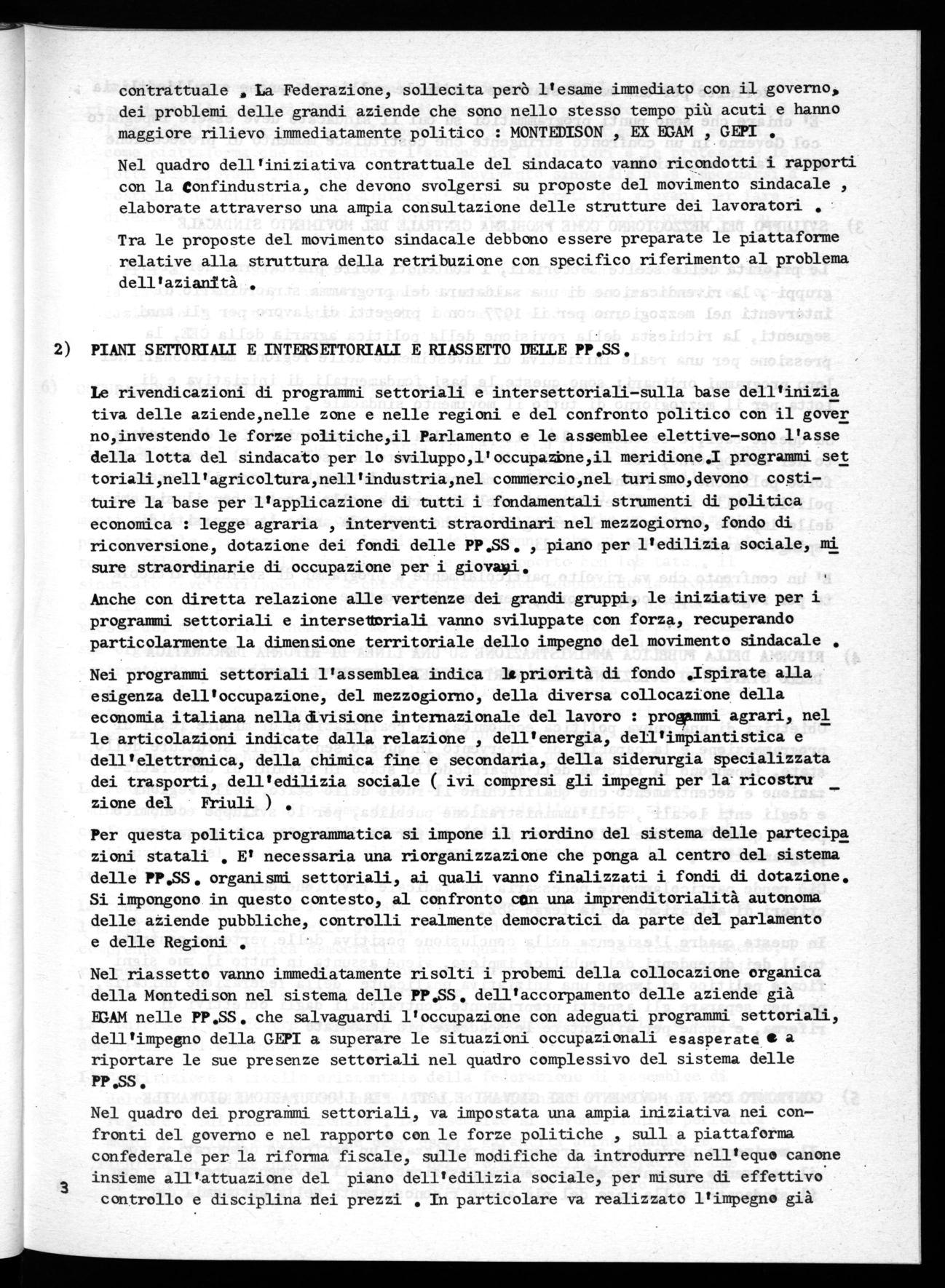 Anche con diretta relazione alle vertenze dei grandi gruppi, le iniziative per i programmi settoriali e intersettoriali vanno sviluppate con forza, recuperando particolarmente la dimensione territoriale dello impegno del movimento sindacale . Nei programmi settoriali l'assemblea indica Itpriorità di fondo .Ispirate alla esigenza dell'occupazione, del mezzogiorno, della diversa collocazione della economia italiana nella divisione internazionale del lavoro : proffimmi agrari, nel le articolazioni indicate dalla relazione , dell'energia, dell'iMpiantistica e dell'elettronica, della chimica fine e secondaria, della siderurgia specializzata dei trasporti, dell'edilizia sociale ( ivi compresi gli impegni per la ricostru _ zione del Friuli )