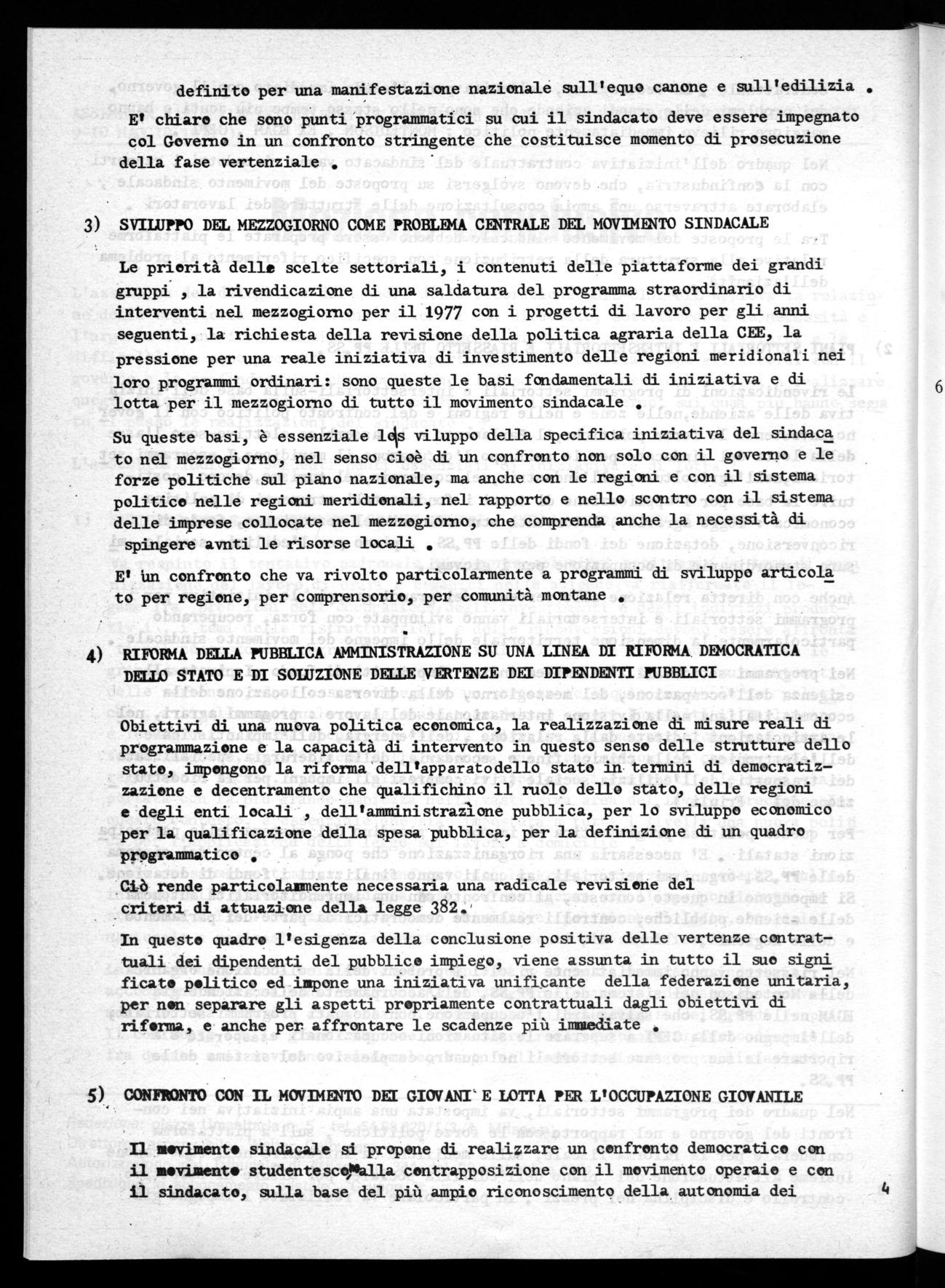 Le priorità delle scelte settoriali, i contenuti delle piattaforme dei grandi gruppi , la rivendicazione di una saldatura del programma straordinario di interventi nel mezzogiorno per il 1977 con i progetti di lavoro per gli anni seguenti, la richiesta della revisione della politica agraria della CEE, la pressione per una reale iniziativa di investimento delle regioni meridionali nei loro programmi ordinari: sono queste le basi fondamentali di iniziativa e di lotta per il mezzogiorno di tutto il movimento sindacale .