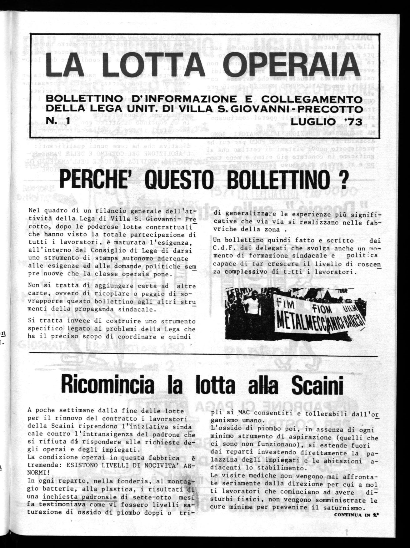 Nel quadro di un rilancio generale dell'attività della Lega di Villa S. Giovanni- Pre cotto, dopo le poderose lotte contrattuali che hanno visto la totale partecipazione di tutti i lavoratori, è maturata l'esigenza, all'interno del Consiglio di Lega dí darsi uno strumento di stampa autonomo aderente alle esigenze ed alle domande politiche sem pre nuove che la classe operaia pone. di aggiungere carta ad altre di ricopiare o peggio di SOvrapporre questo bollettino agli altri stru menti della propaganda sindacale.