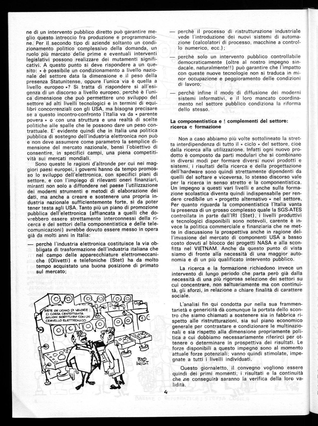 In una parola d'ordine possiamo dire che l'elettronica è un comparto strategico rispetto ad una prospettiva di sviluppo e di indipendenza economica nazionale. Se questo giudizio valeva già ieri, oggi risulta ancor più marcato dati i nuovi equilibri internazionali determinatisi con l'emergenza economica e politica di una buona parte del terzo mondo. Questo giudizio comporta necessariamente, se accettato, il ritenere improrogabili degli investimenti qualificati nel settore controllati nella loro utilizzazione, investimenti anche ingenti e non immediatamente profittevoli tanto da richiedere un impegno pubblico che può andare anche ad aggravare l'attuale indebitamento. D'altra parte l'alternativa sarebbe continuare come si è fatto finora, cioè subire ricatti e complessivamente sopportare le stesse spese nel lungo periodo. Mancando una scelta precisa nella direzione indicata, con la riconversione tutta da fare dei settori che sono stati trainanti nel nostro paese, ci troveremmo vincolati da una doppia dipendenza, quella dalle materie prime e dalle produzioni di massa che sono ormai più economiche nel terzo mondo, da una parte, e quella dei beni tecnologicamente avanzati dall'altra, che sono già di fatto una