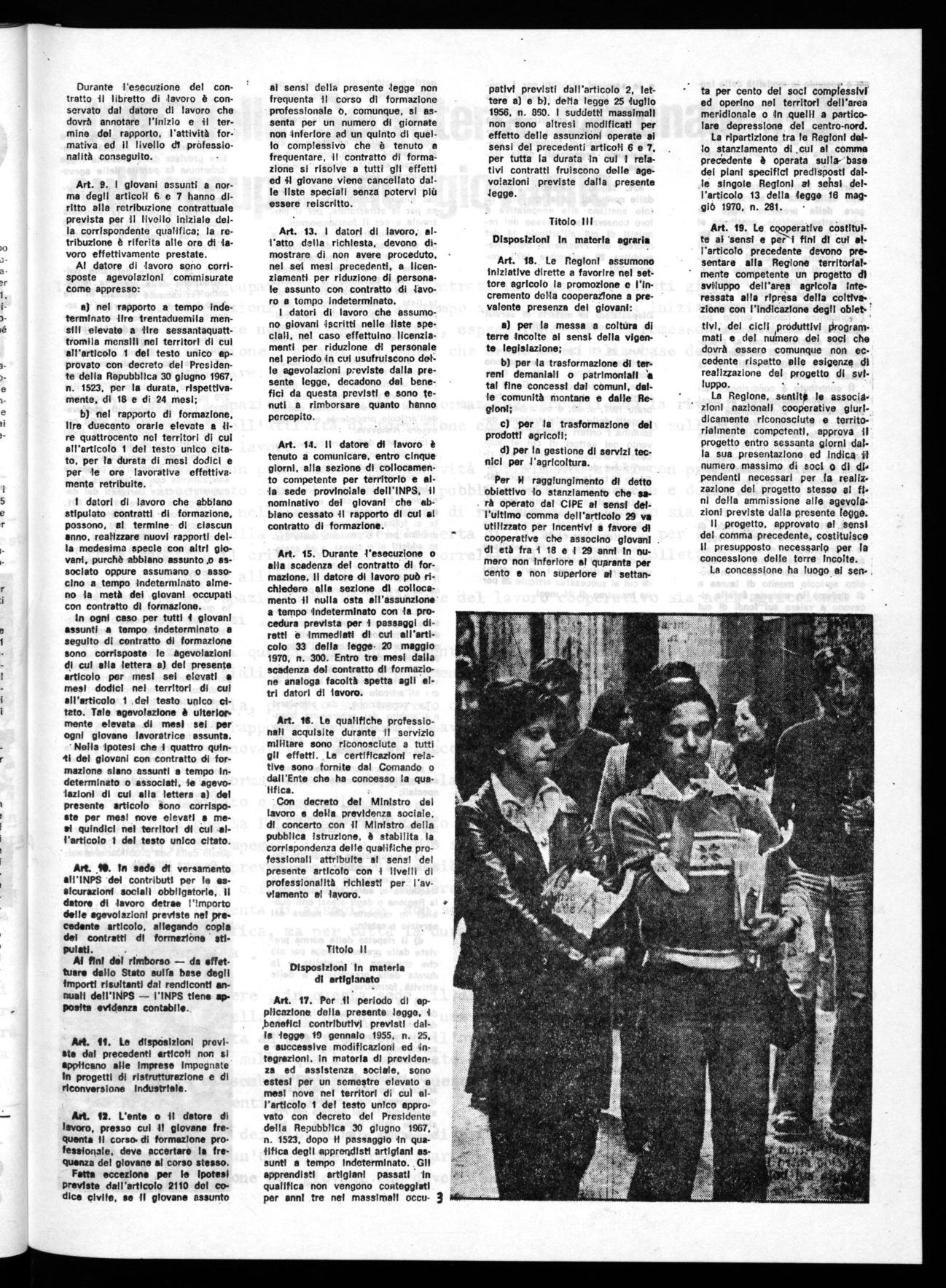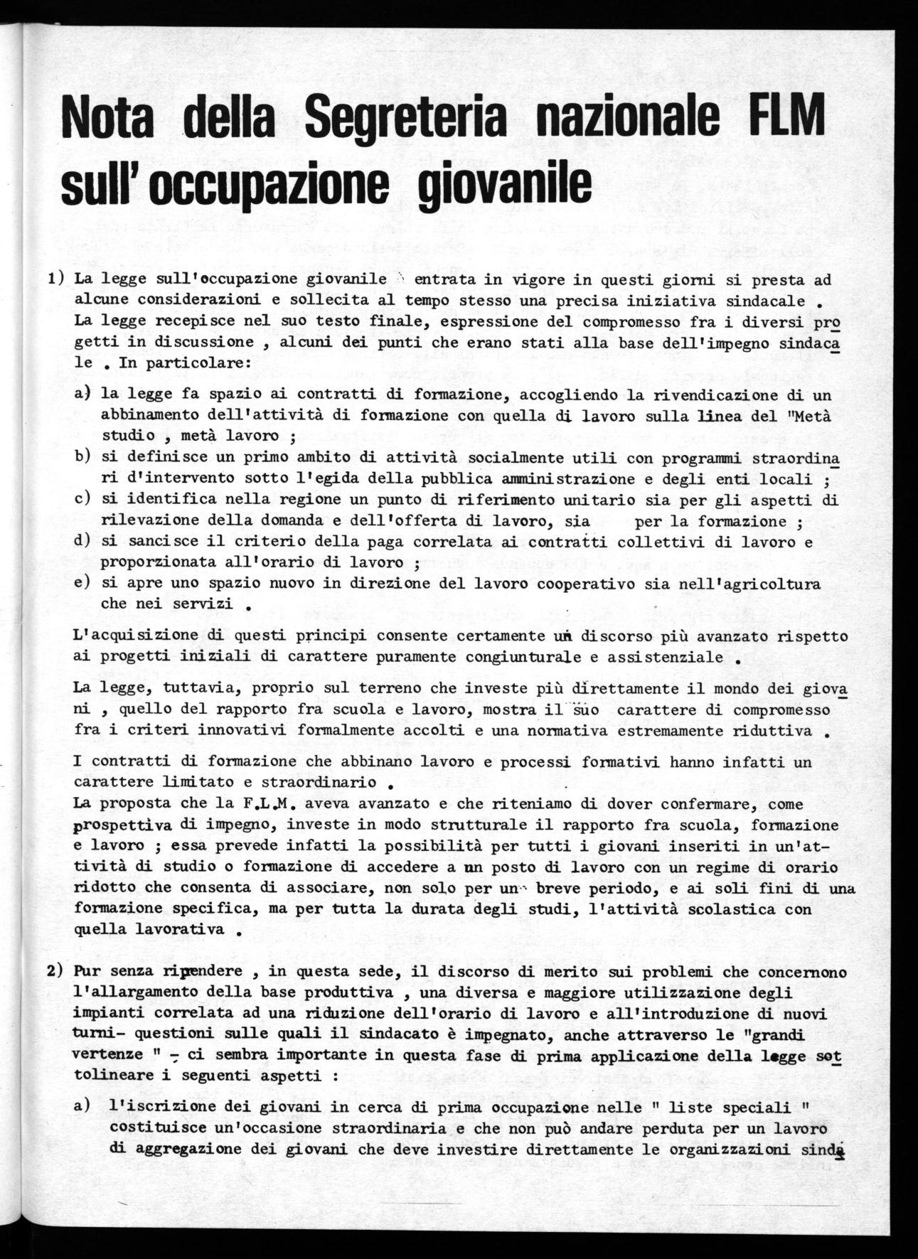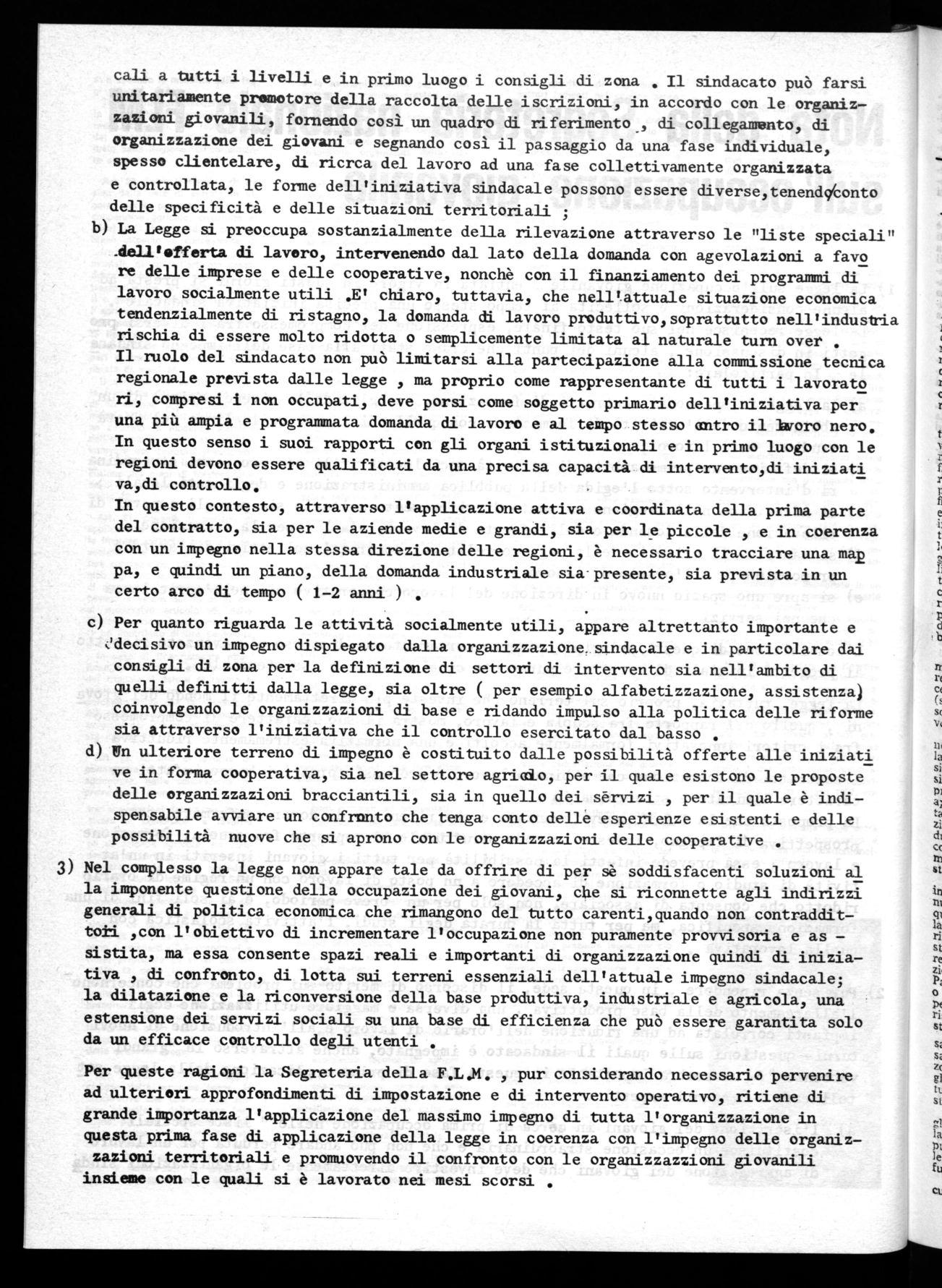3) Nel complesso la legge non appare tale da offrire di per sè soddisfacenti soluzioni al la imponente questione della occupazione dei giovani, che si riconnette agli indirizzi generali di politica economica che rimangono del tutto carenti,quando non contraddittori ,con l'obiettivo di incrementare l'occupazione non puramente provvisoria e assistita, ma essa consente spazi reali e importanti di organizzazione quindi di iniziativa , di confronto, di lotta sui terreni essenziali dell'attuale impegno sindacale; la dilatazione e la riconversione della base produttiva, industriale e agricola, una estensione dei servizi sociali su una base di efficienza che può essere garantita solo da un efficace controllo degli utenti .
