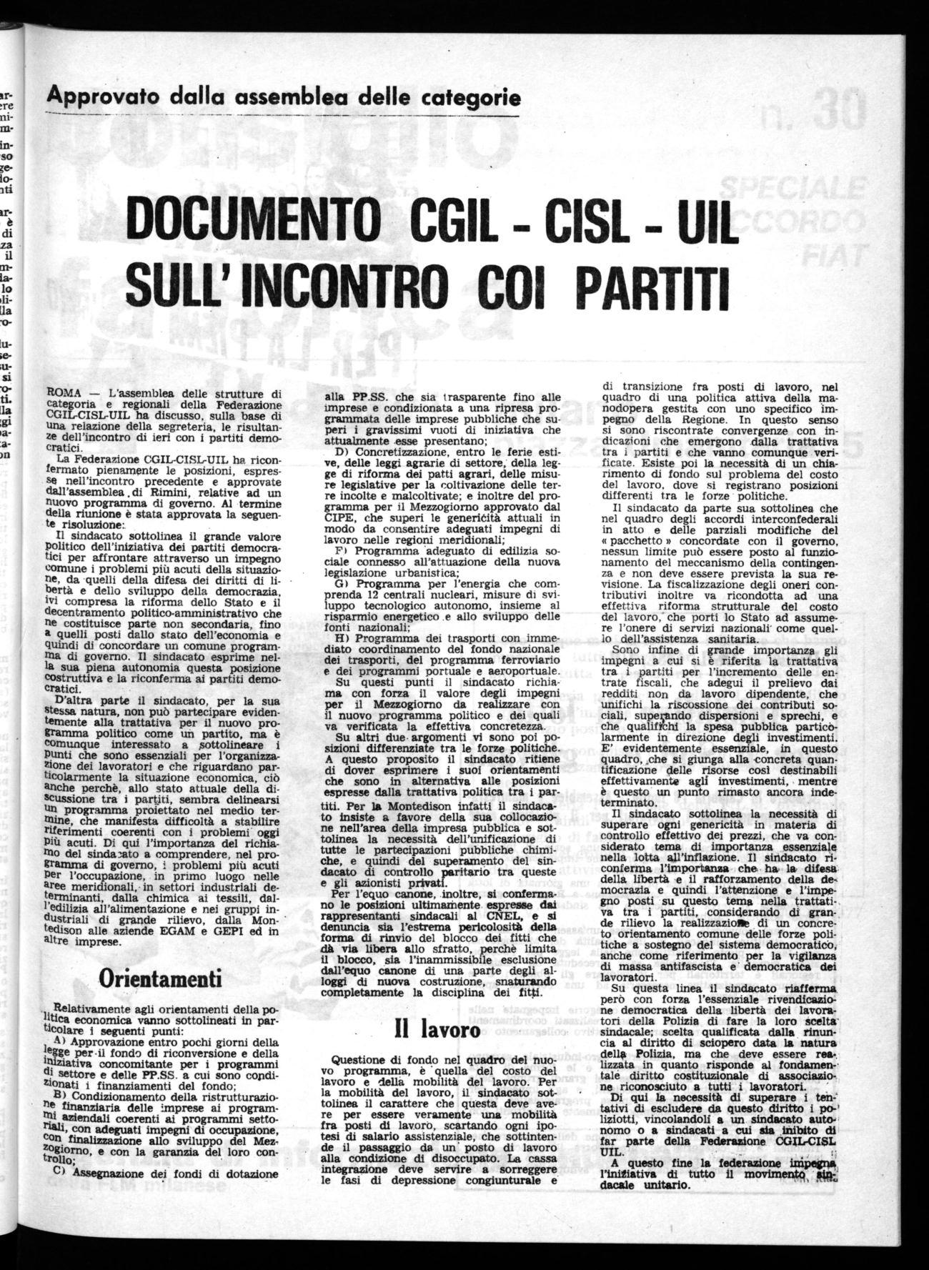 Il sindacato sottolinea il grande valore Politico dell'iniziativa dei partiti democratici per affrontare attraverso un impegno comune i problemi più acuti della situazione, da quelli della difesa dei diritti di libertà e dello sviluppo della democrazia, ivi compresa la riforma dello Stato e il decentramento politico-amministrativo che ne costituisce parte non secondaria, fino a quelli posti dallo stato dell'economia e quindi di concordare un comune programnia di governo. Il sindacato esprime nella sua piena autonomia questa posizione costruttiva e la riconferma ai partiti democratici.