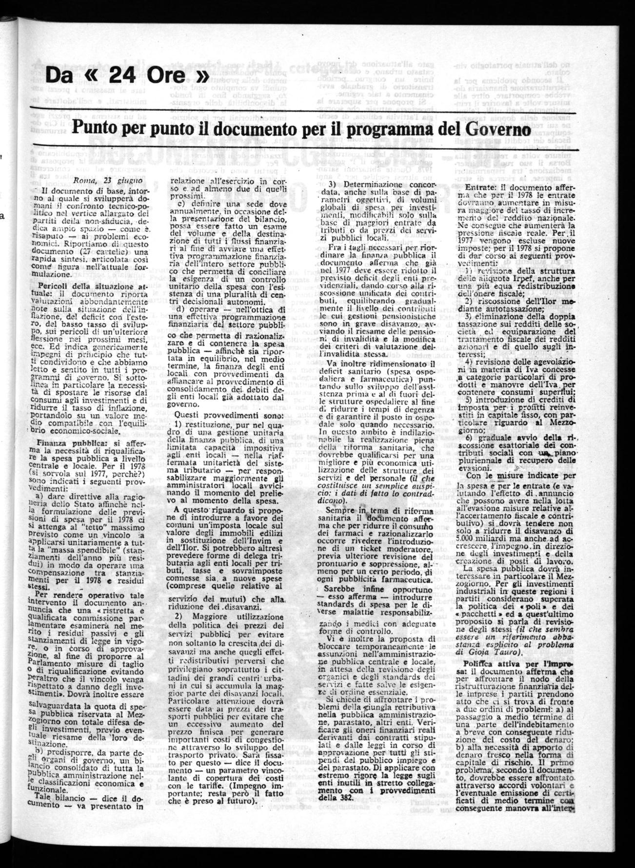 Sono infine di grande importanza gli impegni a cui si è riferita la trattativa tra i partiti per l'incremento delle entrate fiscali, che adegui il prelievo dai redditi non da lavoro dipendente, che unifichi la riscossione dei contributi sociali, superando dispersioni e sprechi, e che qualifichi la spesa pubblica particolarmente in direzione degli investimenti. E' evidentemente essenziale, in questo quadro, .che si giunga alla 'concreta quantificazione delle risorse così destinabili effettivamente agli investimenti, mentre è questo un punto rimasto ancora indeterminato.