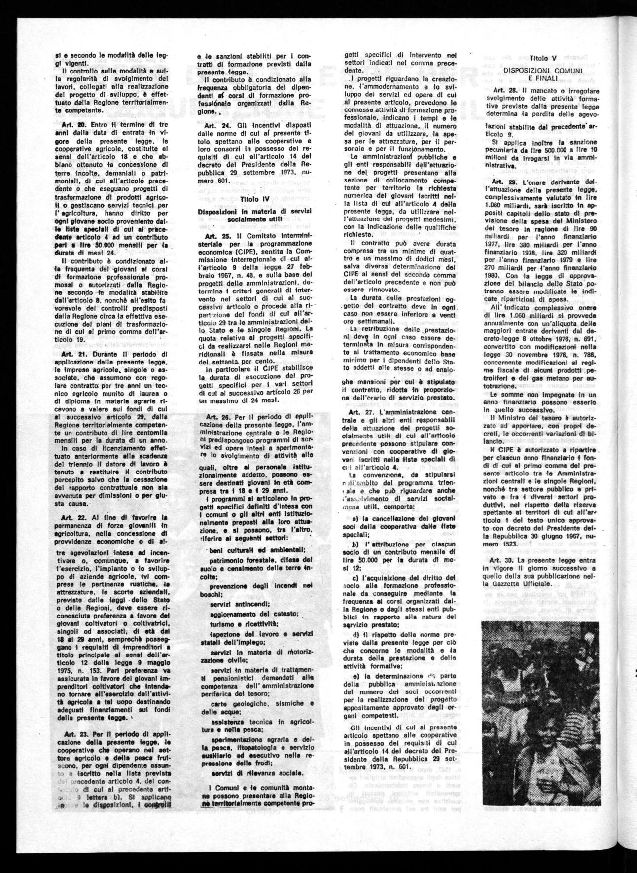 Art. 20. Entro il termine dl tre anni dalla data di entrata In vigore della presente legge, le cooperative agricole, costituite al sensi dell'articolo 18 e che abbiano ottenuto la concessione di terre incolte, demanlaii o patrimoniali, di cui all'articolo precedente o che eseguano progetti di trasformazione dl prodotti agricoli o gestiscano servizi tecnici per I' agricoltura, hanno diritto per ogni giovane socio proveniente dalle liste speciali di cui al precedente articolo 4 ad un contributo pari e lire 50 000 mensili per la durata di mesi 24.