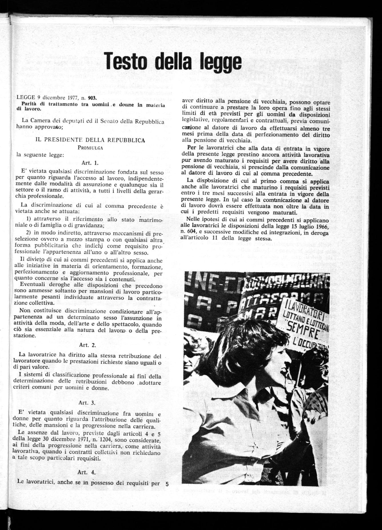 LEGGE 9 dicembre 1977, n. 903. Parità di trattamento tra uomini .e donne In materia di lavoro.