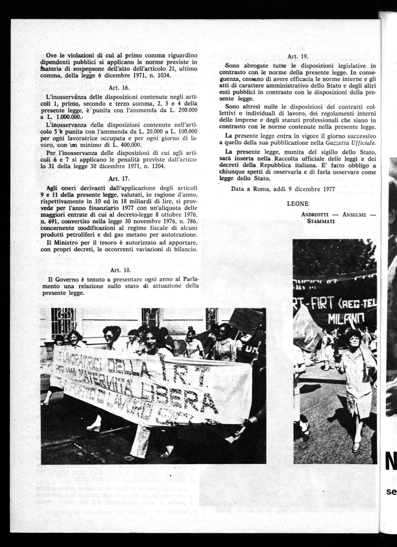 La scelta che dobbiamo fare, affinchè la legge non co: ituisca semplicemente una premessa per la parità e resti perciò disapplicata, è una mobilitazione tempestiva e qualificata da parte di tutto •i_ movimento sindacale, per imporre l'interpretazione e l'applicazione più avanzata e una proposta di impegno di tutte le lavoratrici in una presa di coscienza collet_ tiva della prima condizione e della gestionedei problemi che la legge pone.
