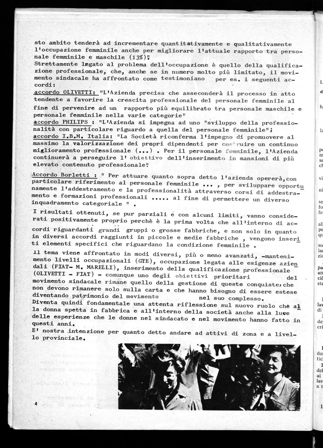 I risultati ottenuti, se pur parziali é con alcuni limiti, vanno conside- rati fe rati positivamente proprio perchè è la prima volta che all'interno di accordi riguardanti grandi gruppi o grosse fabbriche, e non solo in quanto Pe in diversi accordi raggiunti in piccole e medie fabbriche , vengono inceri qt, ti elementi specifici che riguardano la condizione femminile . so