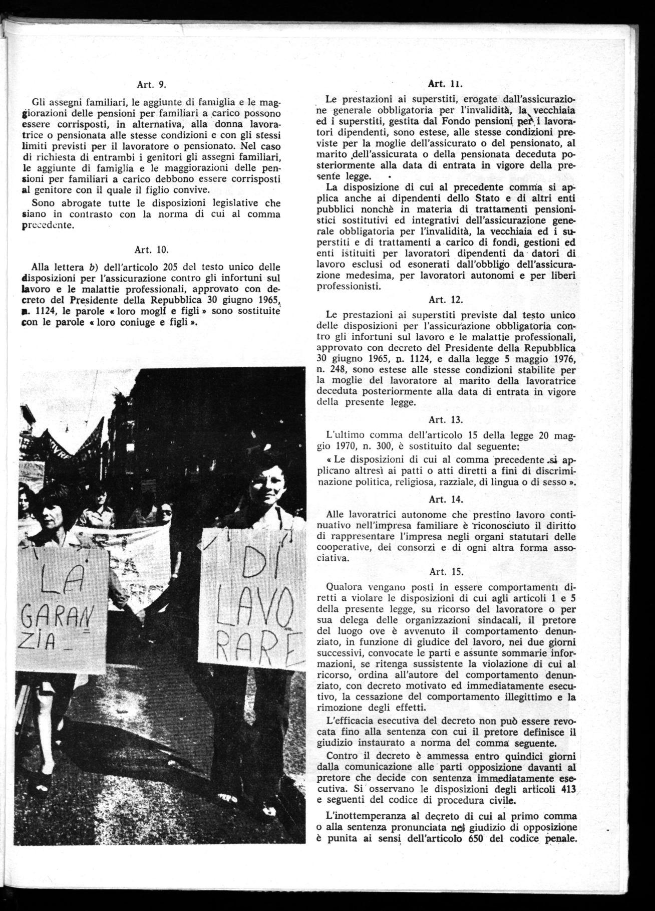 La legge non potrà assolvere, però, alla funzione di innovazione e di trasformazione dei rapporti politici e sociali se non viene coordinata alle altre misure legislative in discussione quali la riforma della scuola, collocamento, e ai provvedimenti di riconversione e di ristrutturazione produttiva.